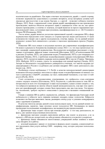 1. Бондаренко Е. А. Искусственный интеллект и проблемы медиаобразования // Медиа. Информация. Коммуникация. 2023. Т. 37, № 2. С. 7-12. Вартанова Е. Л. Цифровая журналистика и медиакоммуникационная среда // МедиаТренды. 2022. № 1 (87). С. 1.