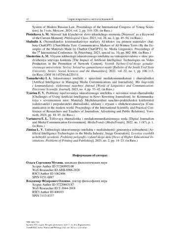 11. Томашевский И. А. Искусственный интеллект в управлении медиакоммуникацией и журналистикой // Мир лингвистики и коммуникации: электронный научный журнал. 2023. № 74. С. 33-42.