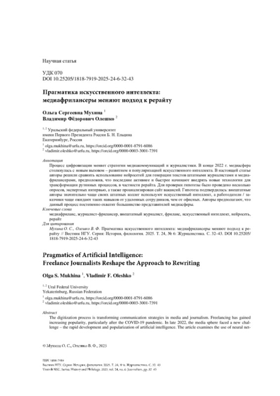 Процесс цифровизации меняет стратегии медиакоммуникаций и журналистики. В конце 2022 г. медиасфера столкнулась с новым вызовом – развитием и популяризацией искусственного интеллекта. В настоящей статье авторы решили сравнить использование нейросетей для генерации текстов штатными журналистами и медиафрилансерами, предположив, что последние активнее и быстрее начинают внедрять новые технологии для трансформации рутинных процессов, в частности рерайта. Для проверки гипотезы было проведено несколько опросов, экспертных интервью, а также проанализирован сайт вакансий. Гипотеза подтвердилась: внештатные авторы значительно чаще своих штатных коллег используют искусственный интеллект, а работодатели / заказчики чаще ожидают таких навыков от удаленных сотрудников, чем от офисных. Авторы предполагают, что данный процесс постепенно охватит большинство представителей медиасферы.