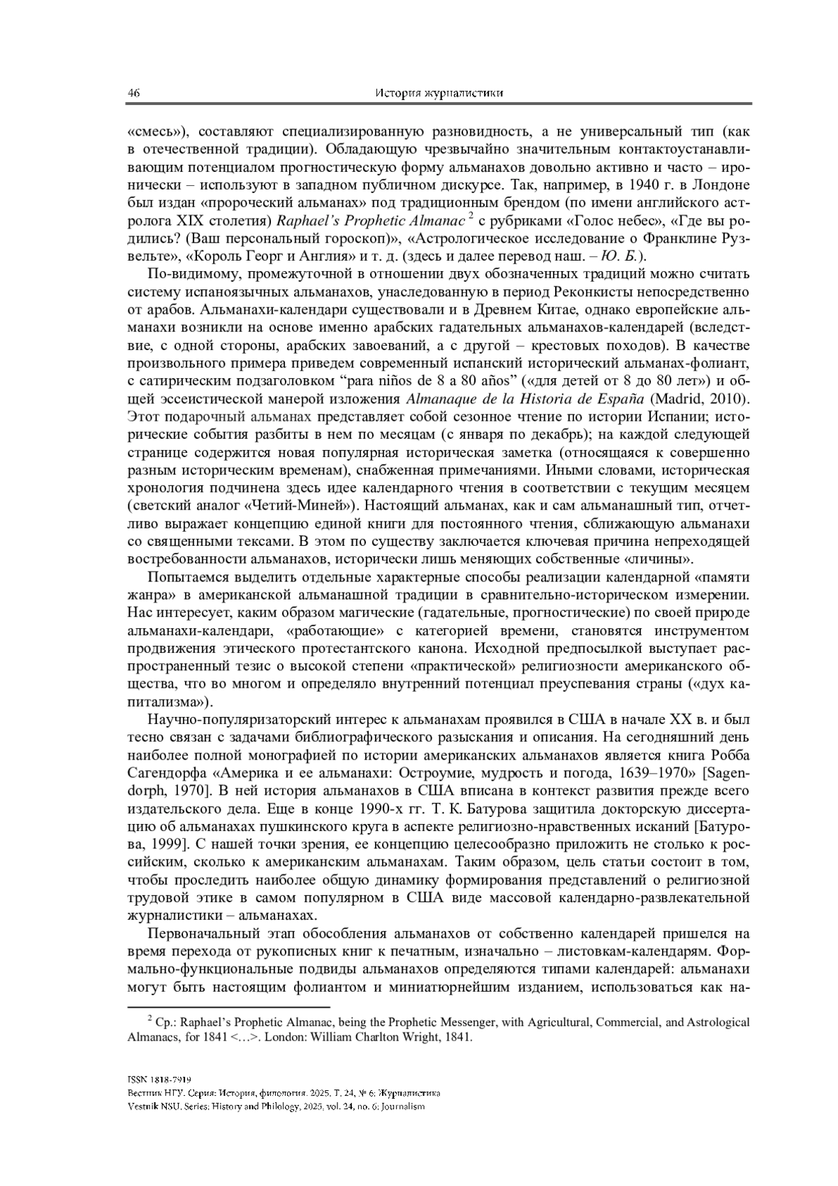 Универсальный тип средневековых альманахов-календарей, измеряющих временные отрезки и обладающих прогностическими функциями, исторически образует две основные транснациональные модели. Первая представлена сначала франко-германскими, а затем, в наиболее последовательном воплощении, российскими литературными «карманными книжками», где связь с календарем эксплицирована поэтологически. Вторая модель – англосаксонская, в более выраженном варианте унаследовавшая функциональный календарный прообраз, имплементирует его в практическом, религиозно-моральном отношении. По отношению к альманахам (российским, американским), ориентированным на европейский образец, утверждение самого альманашного типа совпало с эпохой романтизма. На примере отдельных, преимущественно серийных, американских альманахов, хронологически относящихся к романтической поре, рассматривается тип альманаха как коммуникативного канала распространения ценностей протестантской этики.