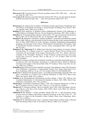 15. Сухотерин Д. Я. Реклама в русской периодике рубежа XIX-XX вв. как пространство формирования массовой культуры: Дис. … канд. культурологии. Киров, 2012. 161 с.