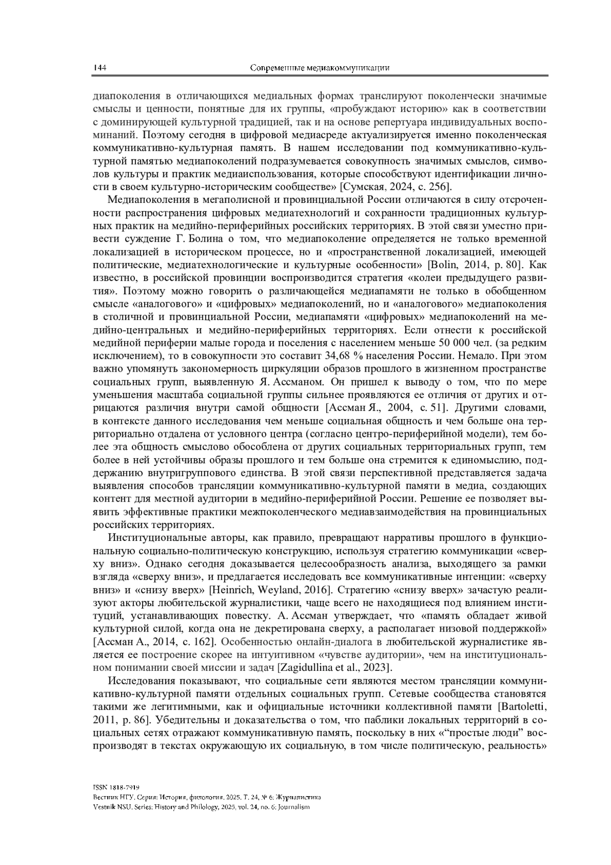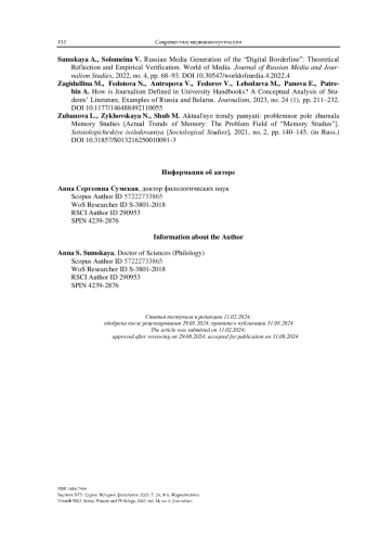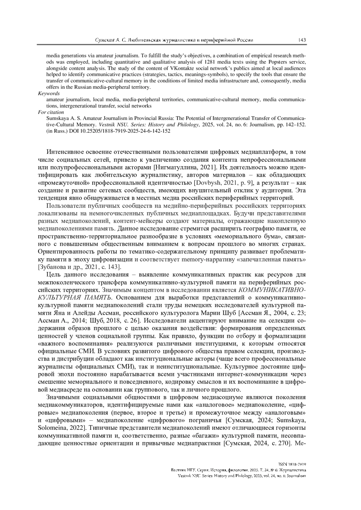 СУМСКАЯ А. С. ЛЮБИТЕЛЬСКАЯ ЖУРНАЛИСТИКА В ПРОВИНЦИАЛЬНОЙ РОССИИ: ПОТЕНЦИАЛ МЕЖПОКОЛЕНЧЕСКОГО ТРАНСФЕРА КОММУНИКАТИВНО-КУЛЬТУРНОЙ ПАМЯТИ // ВЕСТНИК НГУ. СЕРИЯ: ИСТОРИЯ, ФИЛОЛОГИЯ. 2025. ТОМ 24, № 6