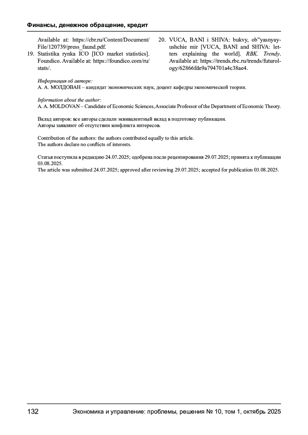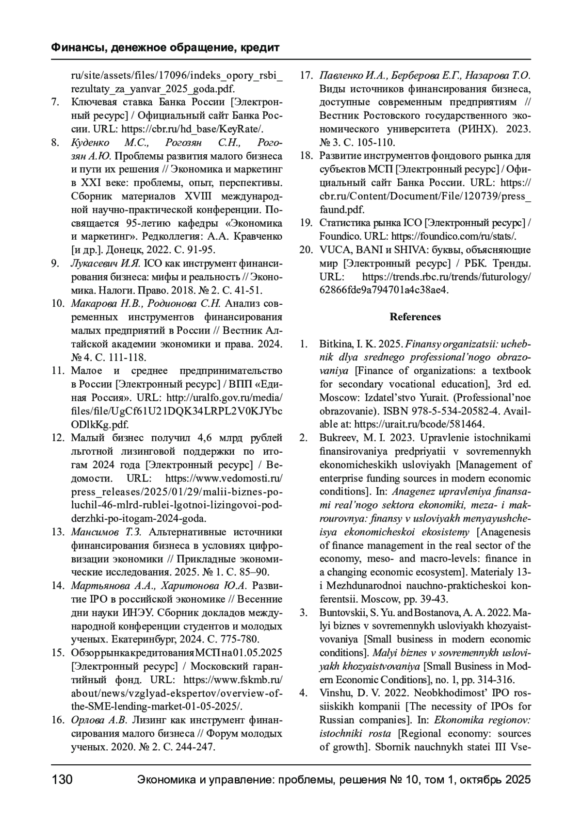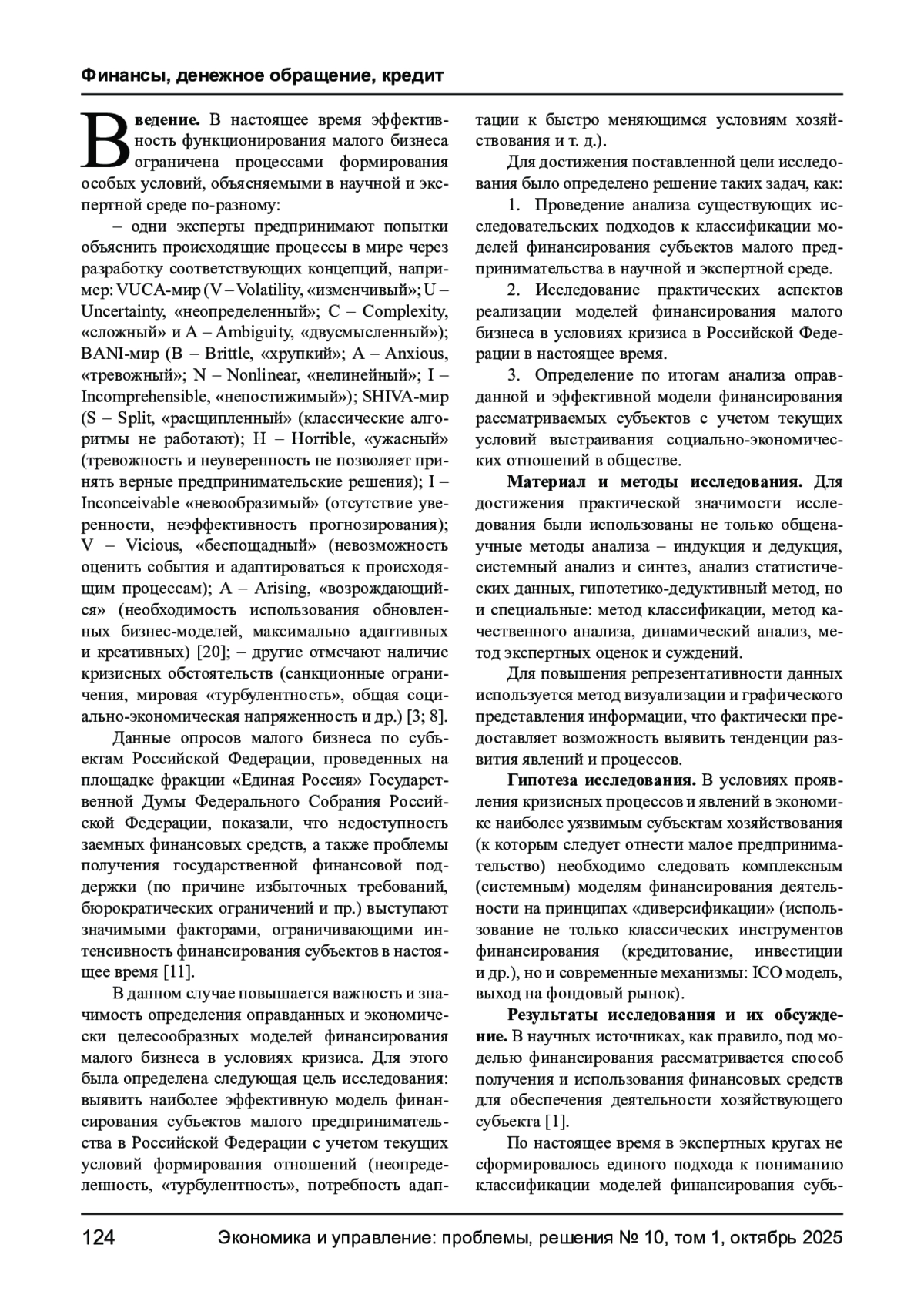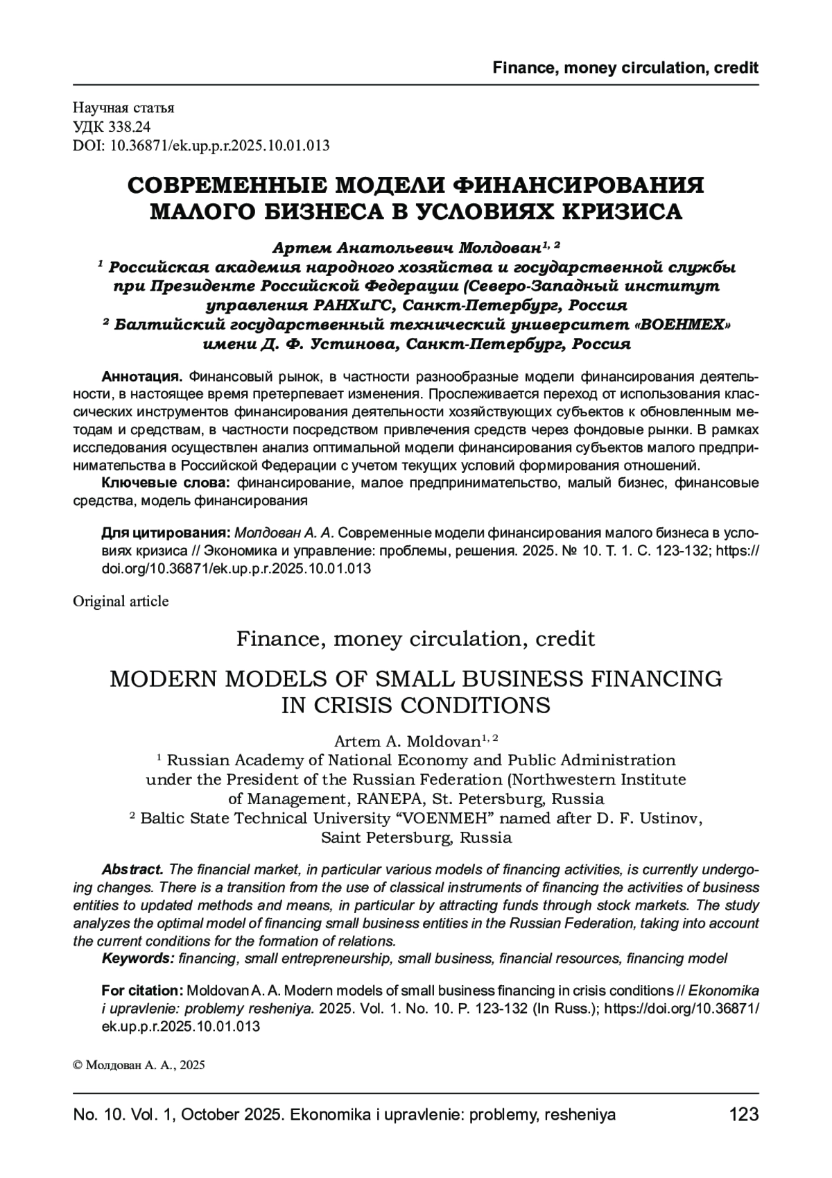 МОЛДОВАН А. А. СОВРЕМЕННЫЕ МОДЕЛИ ФИНАНСИРОВАНИЯ МАЛОГО БИЗНЕСА В УСЛОВИЯХ КРИЗИСА // ЭКОНОМИКА И УПРАВЛЕНИЕ: ПРОБЛЕМЫ, РЕШЕНИЯ. 2025. ТОМ 1 № 10