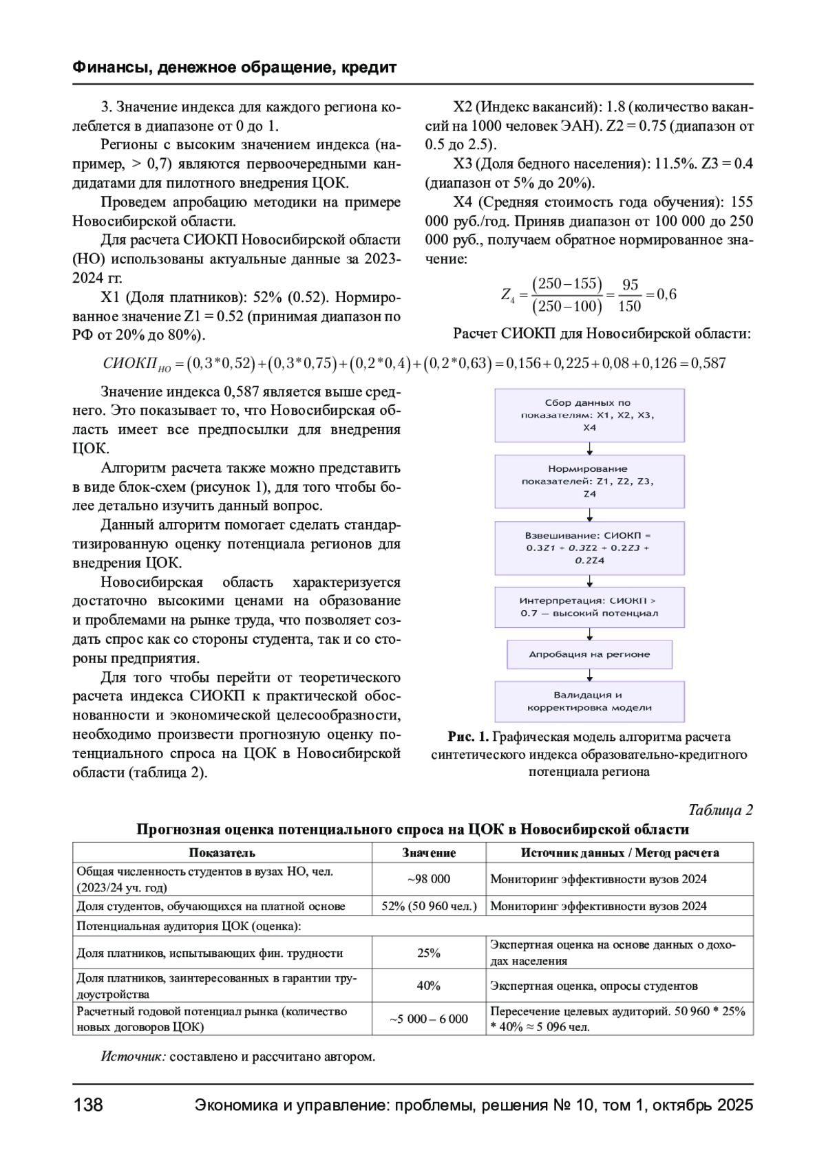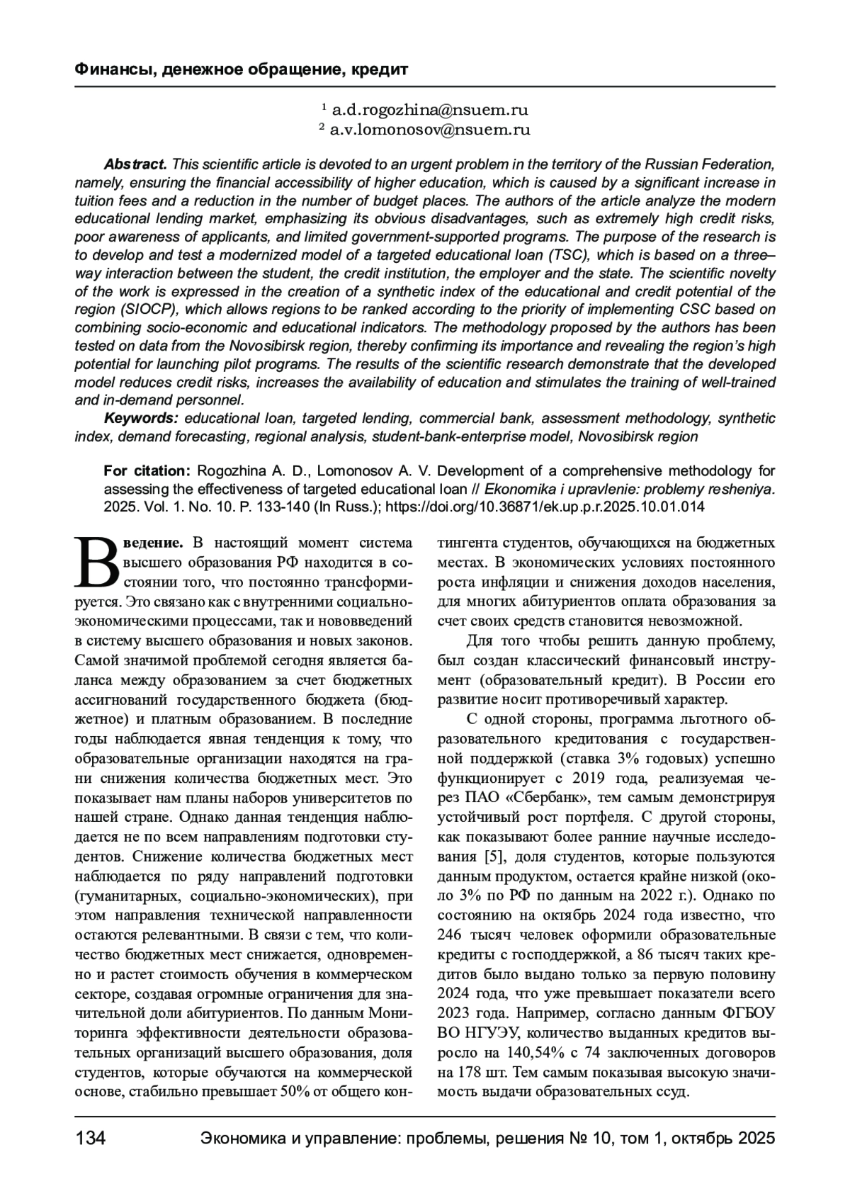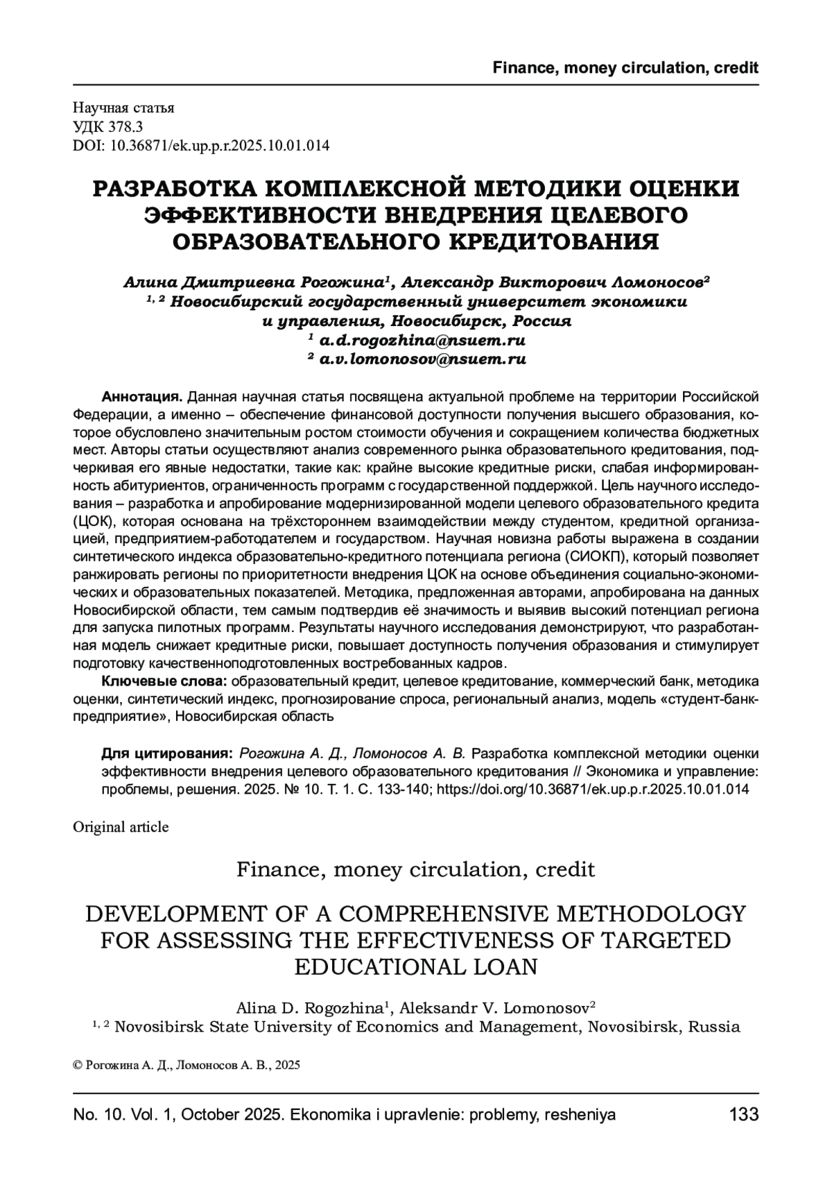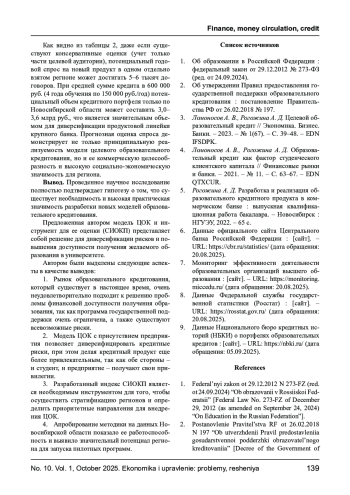 Данная научная статья посвящена актуальной проблеме на территории Российской Федерации, а именно - обеспечение финансовой доступности получения высшего образования, которое обусловлено значительным ростом стоимости обучения и сокращением количества бюджетных мест. Авторы статьи осуществляют анализ современного рынка образовательного кредитования, подчеркивая его явные недостатки, такие как: крайне высокие кредитные риски, слабая информированность абитуриентов, ограниченность программ с государственной поддержкой. Цель научного исследования - разработка и апробирование модернизированной модели целевого образовательного кредита (ЦОК), которая основана на трёхстороннем взаимодействии между студентом, кредитной организацией, предприятием-работодателем и государством. Научная новизна работы выражена в создании синтетического индекса образовательно-кредитного потенциала региона (СИОКП), который позволяет ранжировать регионы по приоритетности внедрения ЦОК на основе объединения социально-экономических и образовательных показателей. Методика, предложенная авторами, апробирована на данных Новосибирской области, тем самым подтвердив её значимость и выявив высокий потенциал региона для запуска пилотных программ. Результаты научного исследования демонстрируют, что разработанная модель снижает кредитные риски, повышает доступность получения образования и стимулирует подготовку качественно подготовленных востребованных кадров.