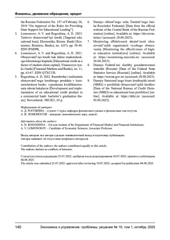4. Ломоносов А. В., Рогожина А. Д. Образовательный кредит как фактор студенческого клиентского капитала // Финансовые рынки и банки. - 2021. - № 11. - С. 63-67. EDN: QTXCUR