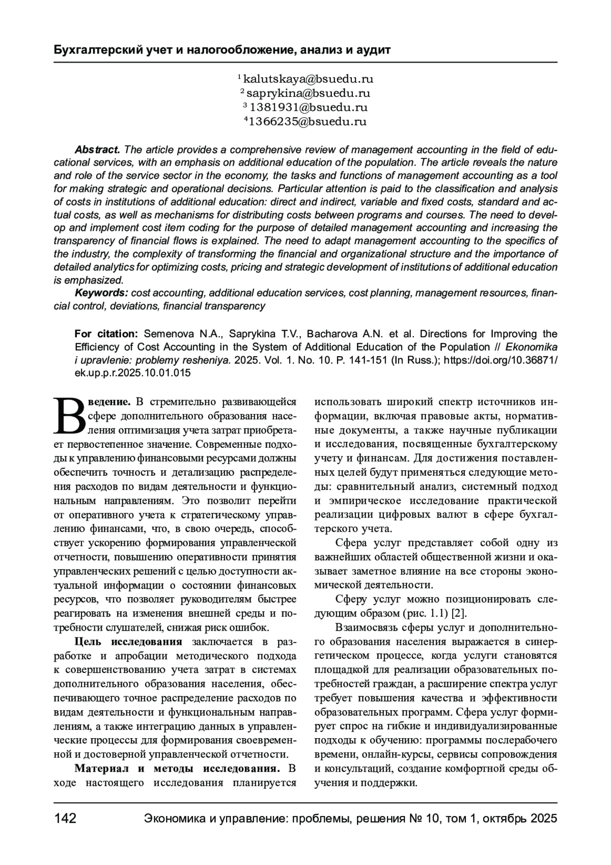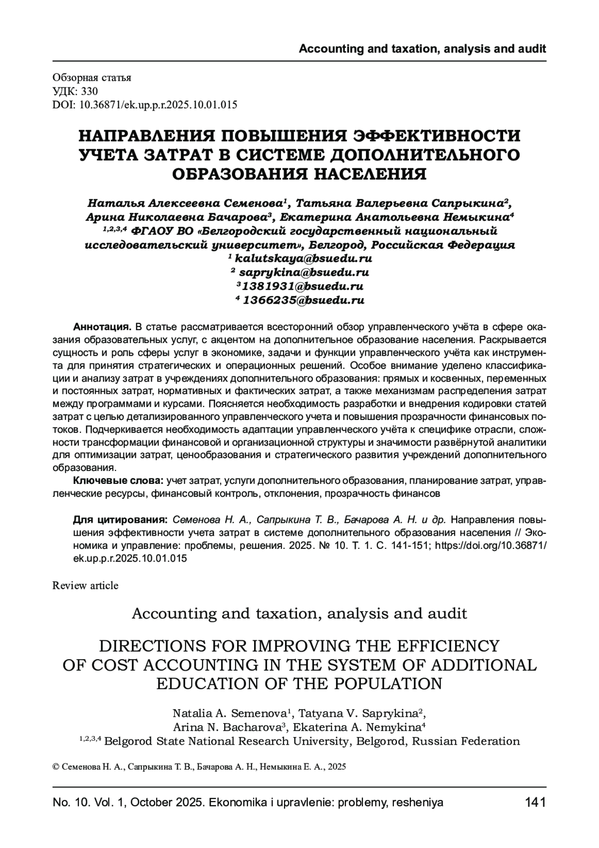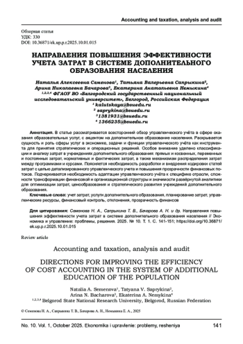 СЕМЕНОВА Н. А., САПРЫКИНА Т. В., БАЧАРОВА А. Н., НЕМЫКИНА Е. А. НАПРАВЛЕНИЯ ПОВЫШЕНИЯ ЭФФЕКТИВНОСТИ УЧЕТА ЗАТРАТ В СИСТЕМЕ ДОПОЛНИТЕЛЬНОГО ОБРАЗОВАНИЯ НАСЕЛЕНИЯ // ЭКОНОМИКА И УПРАВЛЕНИЕ: ПРОБЛЕМЫ, РЕШЕНИЯ. 2025. ТОМ 1 № 10