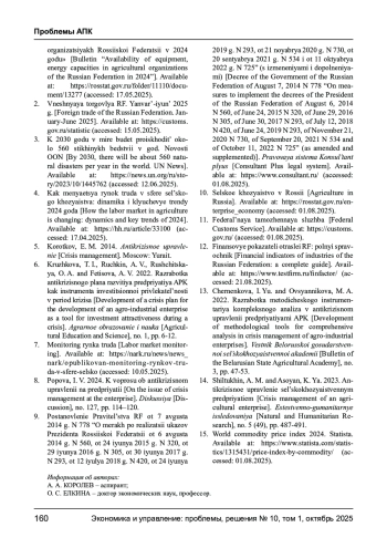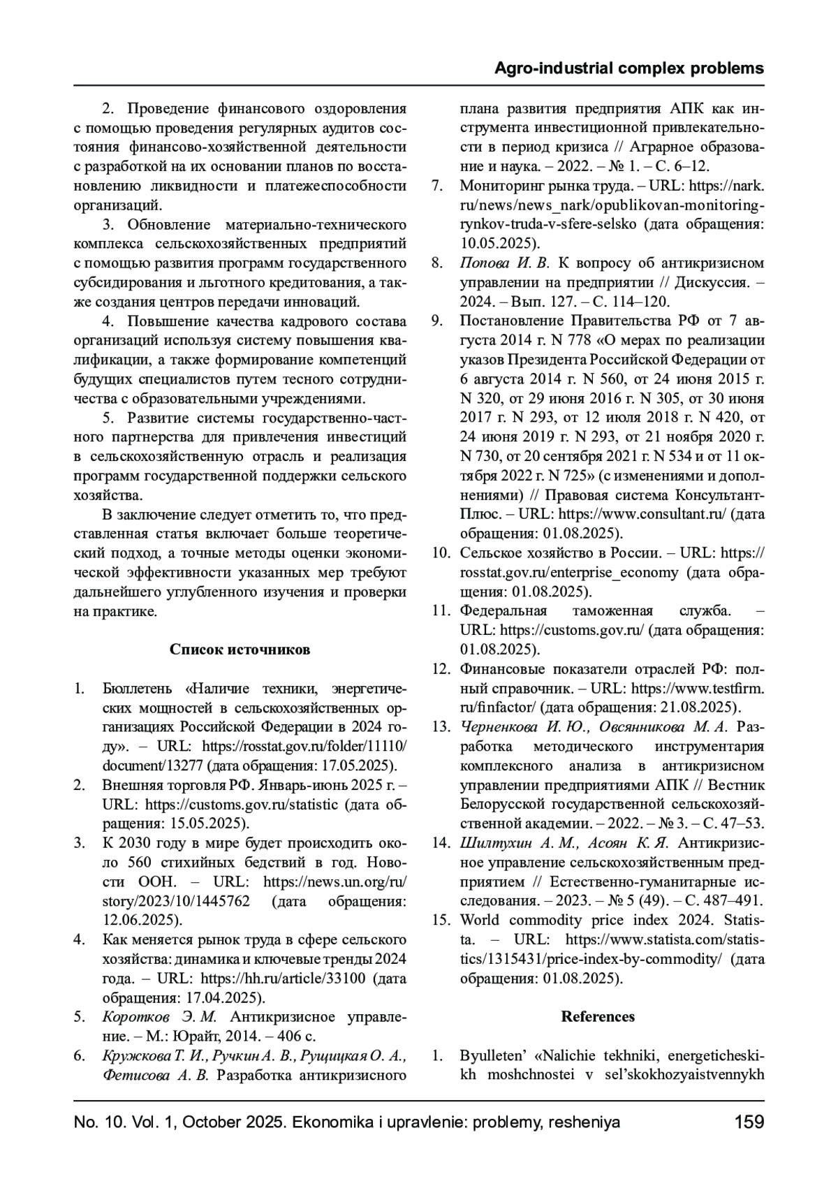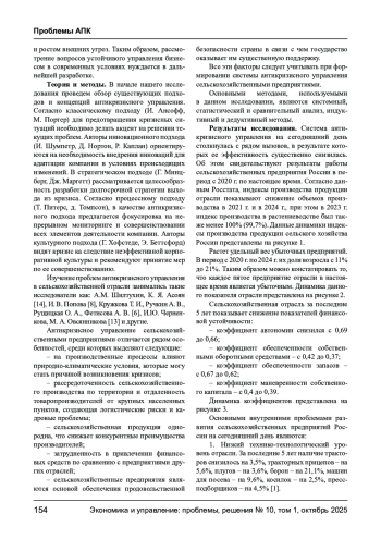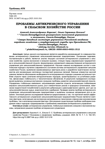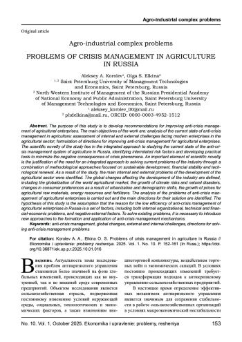 Статья: ПРОБЛЕМЫ АНТИКРИЗИСНОГО УПРАВЛЕНИЯ В СЕЛЬСКОМ ХОЗЯЙСТВЕ РОССИИ (2025)