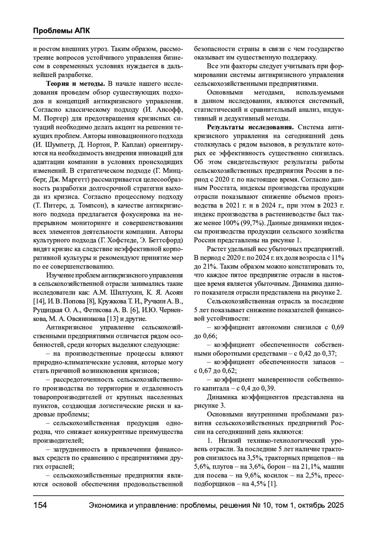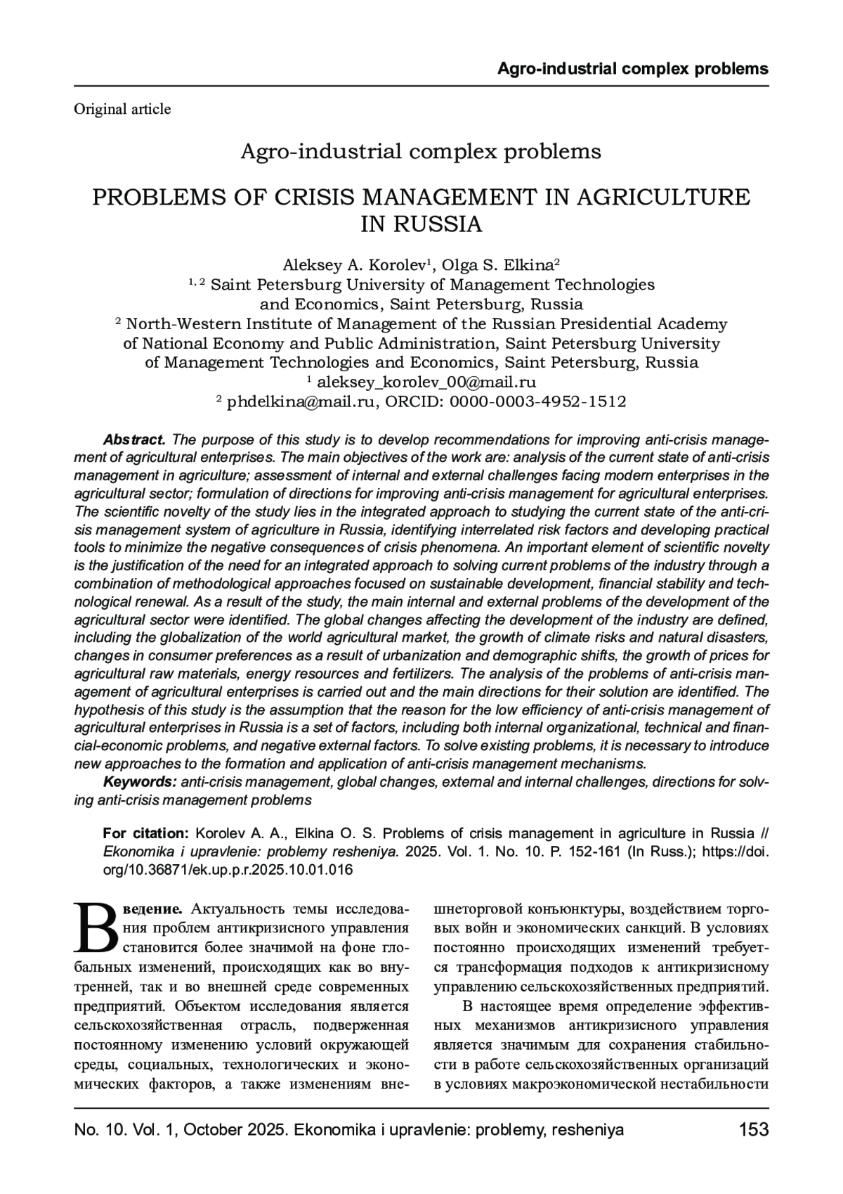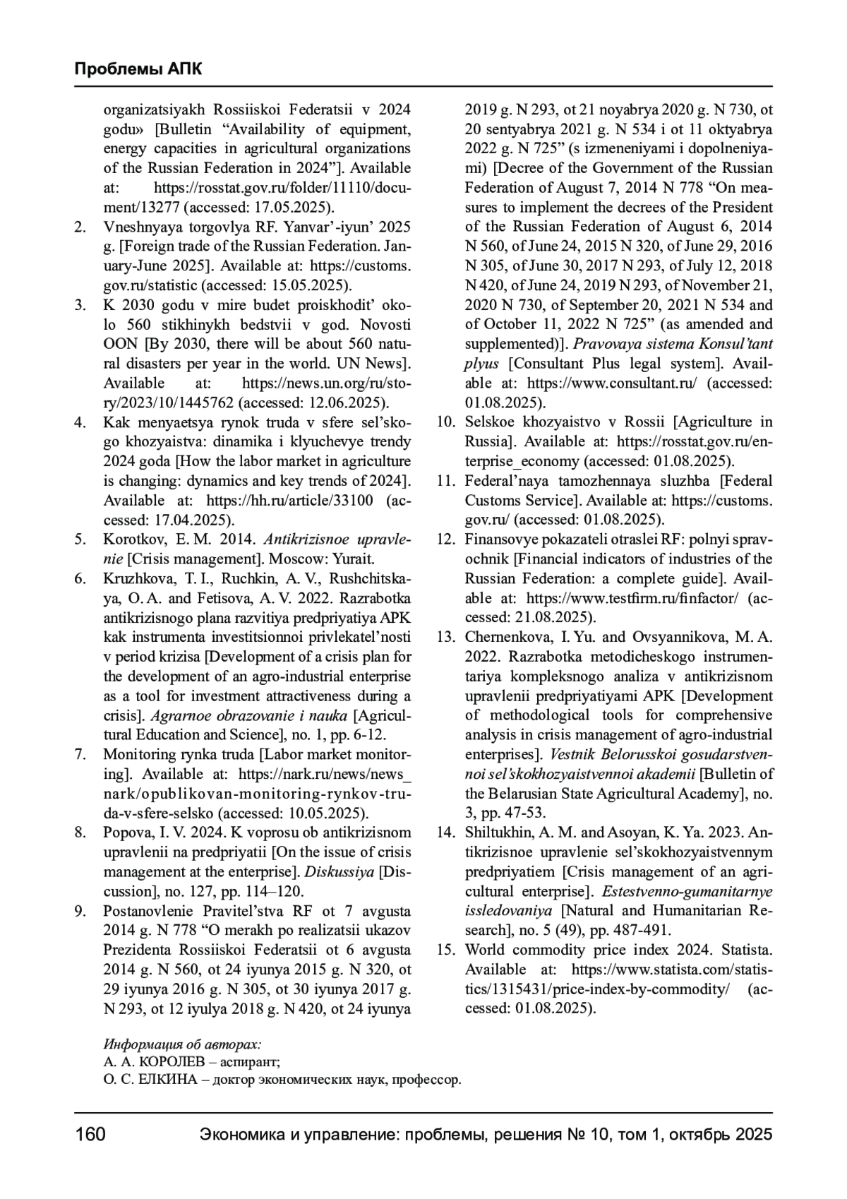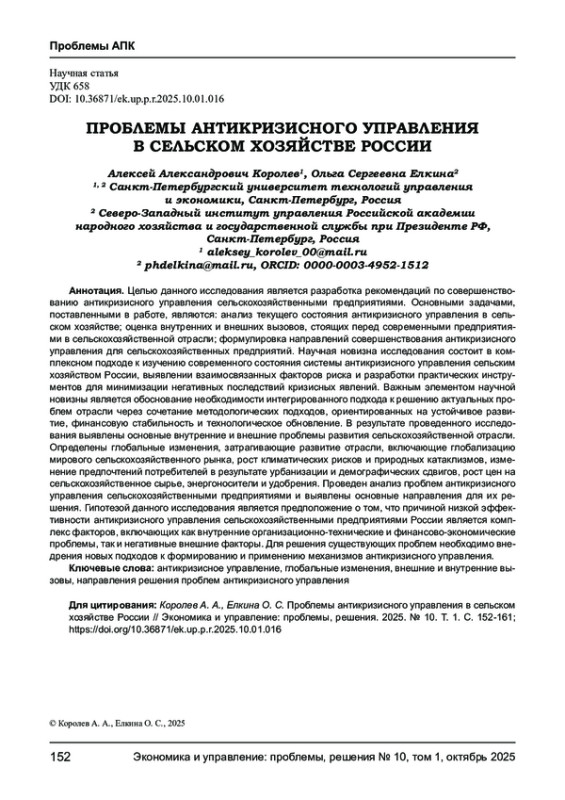 КОРОЛЕВ А. А., ЕЛКИНА О. С. ПРОБЛЕМЫ АНТИКРИЗИСНОГО УПРАВЛЕНИЯ В СЕЛЬСКОМ ХОЗЯЙСТВЕ РОССИИ // ЭКОНОМИКА И УПРАВЛЕНИЕ: ПРОБЛЕМЫ, РЕШЕНИЯ. 2025. ТОМ 1 № 10