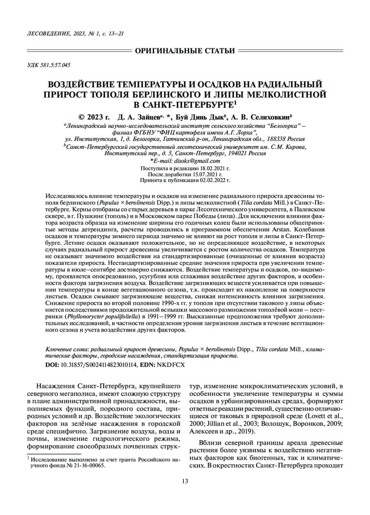 Исследовалось влияние температуры и осадков на изменение радиального прироста древесины тополя берлинского (Populus × berolinensis Dipp.) и липы мелколистной (Tilia cordata Mill.) в Санкт-Петербурге. Керны отобраны со старых деревьев в парке Лесотехнического университета, в Палевском сквере, в г. Пушкине (тополь) и в Московском парке Победы (липа). Для исключения влияния фактора возраста образца на изменение ширины его годичных колец были использованы общепринятые методы детрендинга, расчеты проводились в программном обеспечении Arstan. Колебания осадков и температуры зимнего периода значимо не влияют на рост тополя и липы в Санкт-Петербурге. Летние осадки оказывают положительное, но не определяющее воздействие, в некоторых случаях радиальный прирост древесины увеличивается с ростом количества осадков. Температура не оказывает значимого воздействия на стандартизированные (очищенные от влияния возраста) показатели прироста. Нестандартизированные средние значения прироста при увеличении температуры в июле–сентябре достоверно снижаются. Воздействие температуры и осадков, по-видимому, проявляется опосредованно, усугубляя или сглаживая воздействие других факторов, в особенности фактора загрязнения воздуха. Воздействие загрязняющих веществ усиливается при повышении температуры в конце вегетационного сезона, т. к. происходит их накопление на поверхности листьев. Осадки смывают загрязняющие вещества, снижая интенсивность влияния загрязнения. Снижение прироста во второй половине 1990-х гг. у тополя при отсутствии такового у липы объясняется последствиями продолжительной вспышки массового размножения тополёвой моли – пестрянки (Phyllonorycter populifoliella) в 1991–1999 гг. Высказанные предположения требуют дополнительных исследований, в частности определения уровня загрязнения листьев в течение вегетационного сезона и учета воздействия других факторов