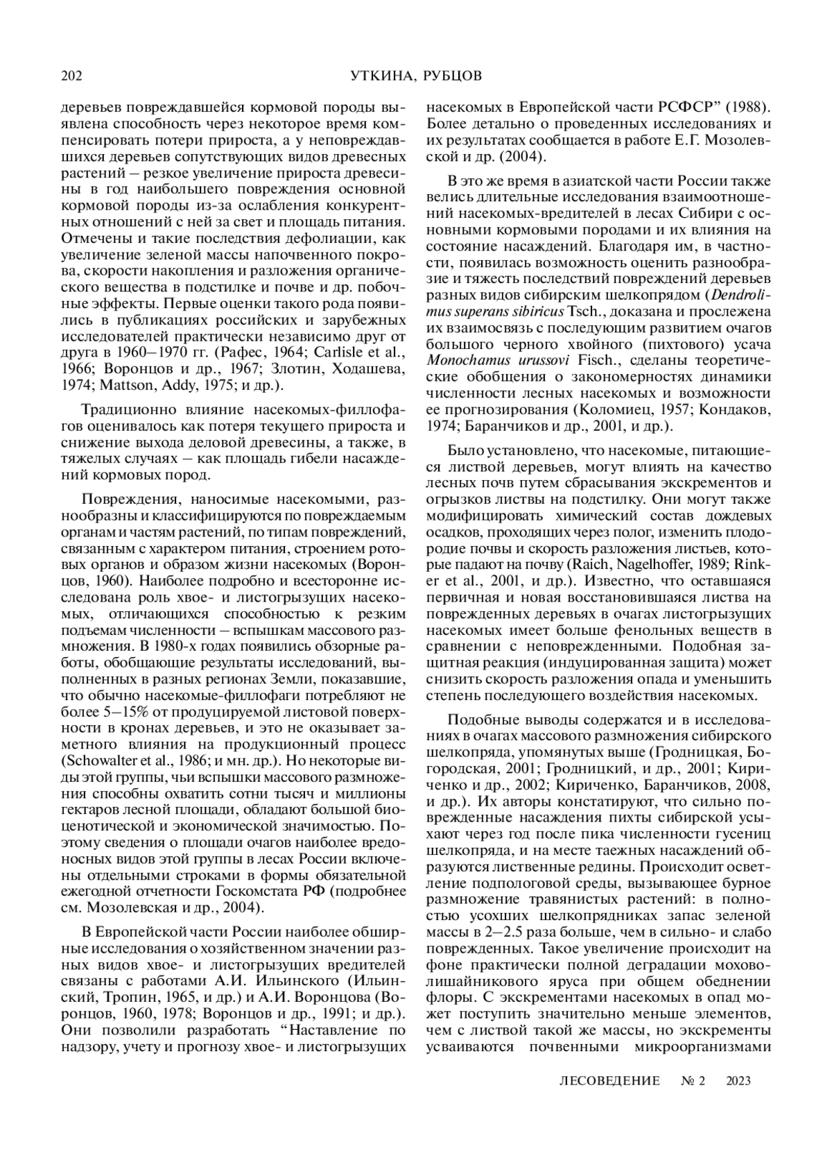 22. Мозолевская Е.Г., Рубцов В.В., Уткина И.А. Оценка роли дендрофильных насекомых в лесных биогеоценозах // Ю.И. Чернов (отв. ред.) Насекомые в лесных биоценозах. ХХ чтения памяти академика В.Н. Сукачева, 22 ноября 2002 г. Москва: Т-во научных изданий КМК, 2004. С. 5-31.