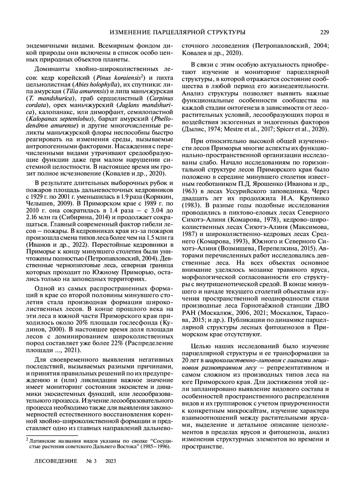18. Москалюк Т.А. Трансформация травяного яруса за 20 лет восстановительной сукцессии в широколиственных лесах с лиановой растительностью на юге Приморского края // Комаровские чтения, 2021. Вып. LXIX. С. 26–78.