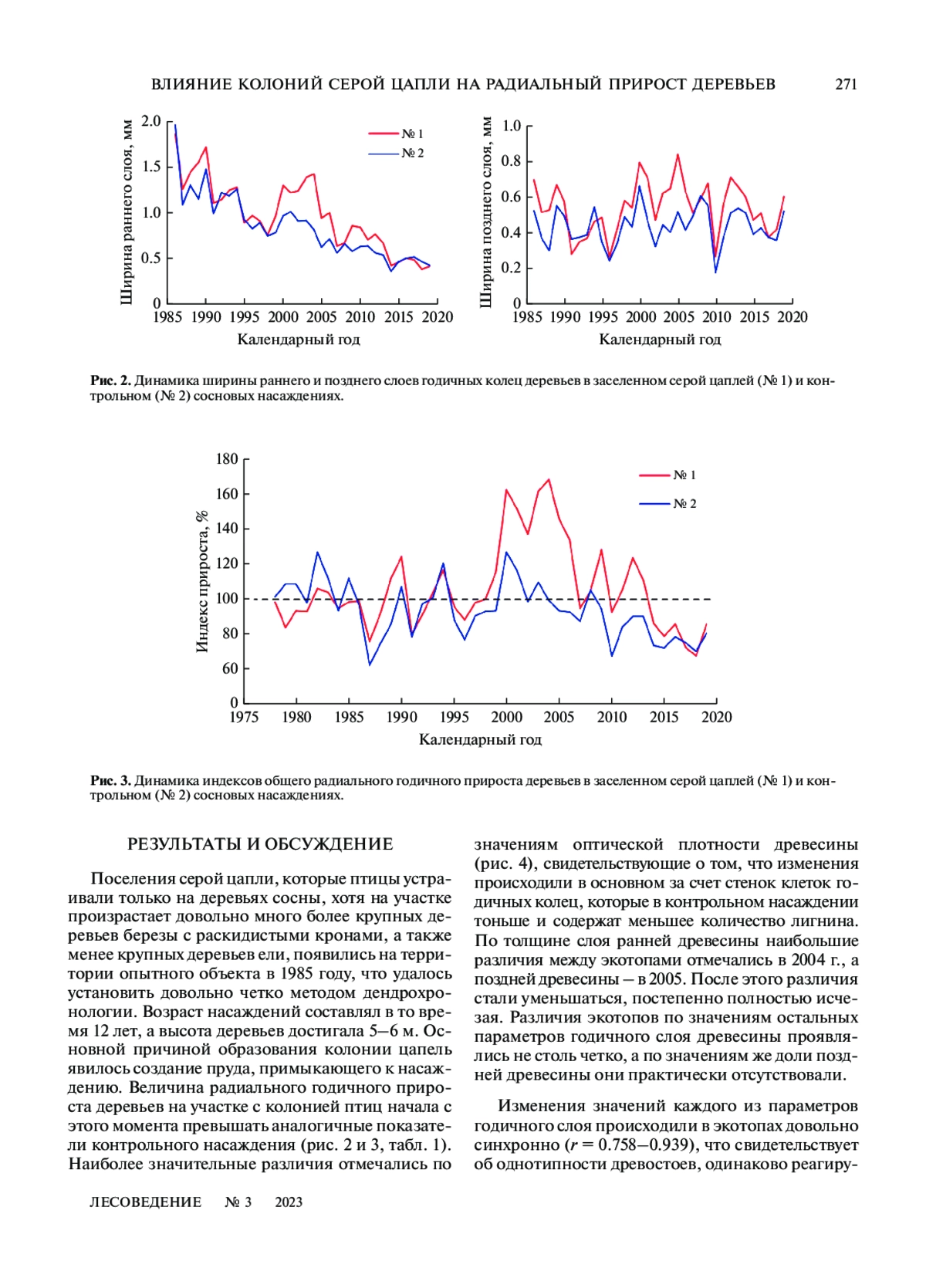 Приведены данные по влиянию колоний серой цапли (Ardea cinerea L., 1758) на динамику параметров годичного кольца деревьев в сосняках искусственного происхождения. Показано, что начало колонизации насаждений серой цаплей можно довольно точно установить при анализе динамики параметров годичных колец деревьев, особенно ширины их позднего слоя и оптической плотности древесины (значения первого из этих параметров в контрольном насаждении ниже, а второго выше). Колонии серой цапли начинают появляться в сосняках уже с 10–12-летнего возраста, когда высота деревьев достигает 5–6 м, а диаметр ствола на высоте 1.3 м от поверхности почвы – всего 7–8 см. В первые 15–20 лет они оказывают положительное влияние на годичный прирост деревьев, особенно на ширину позднего слоя древесины и толщину клеточных стенок, но затем картина меняется на противоположную. Общее время пребывания колоний цапли на одном месте составляет около 35– 40 лет, после чего они переселяются на новые места в связи с расстройством или же полной гибелью насаждений. Для снижения вероятности появления колоний серой цапли, которые во многих случаях оказывают отрицательное влияние на состояние лесных биогеоценозов, необходимо отказаться от создания вблизи водоемов чистых сосняков, отдавая предпочтение еловым, березовым, тополевым или же липово-дубовым насаждениям