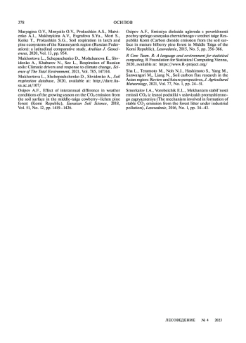 6. Осипов А.Ф. Эмиссия диоксида углерода с поверхности почвы спелого сосняка черничного в средней тайге Республики Коми // Лесоведение. 2015. № 5. С. 355–366. EDN: UMTGLV