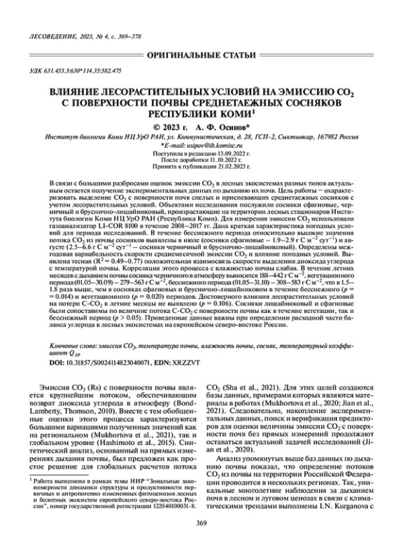 24. Osipov A.F. Effect of interannual difference in weather conditions of the growing season on the CO2 emission from the soil surface in the middle-taiga cowberry–lichen pine forest (Komi Republic) // Eurasian Soil Science. 2018. V. 51. № 12. P. 1419–1426. EDN: WUOIPD