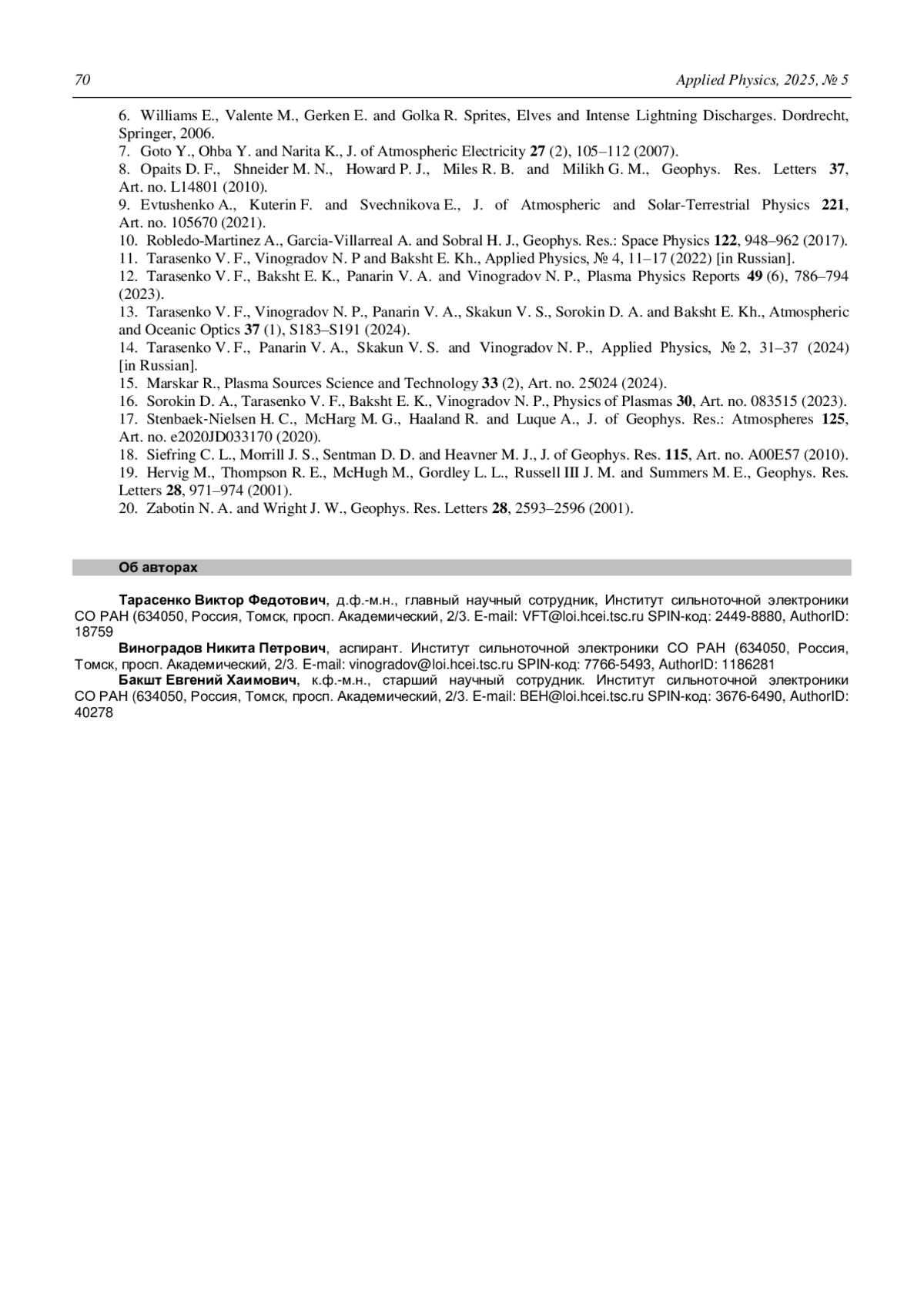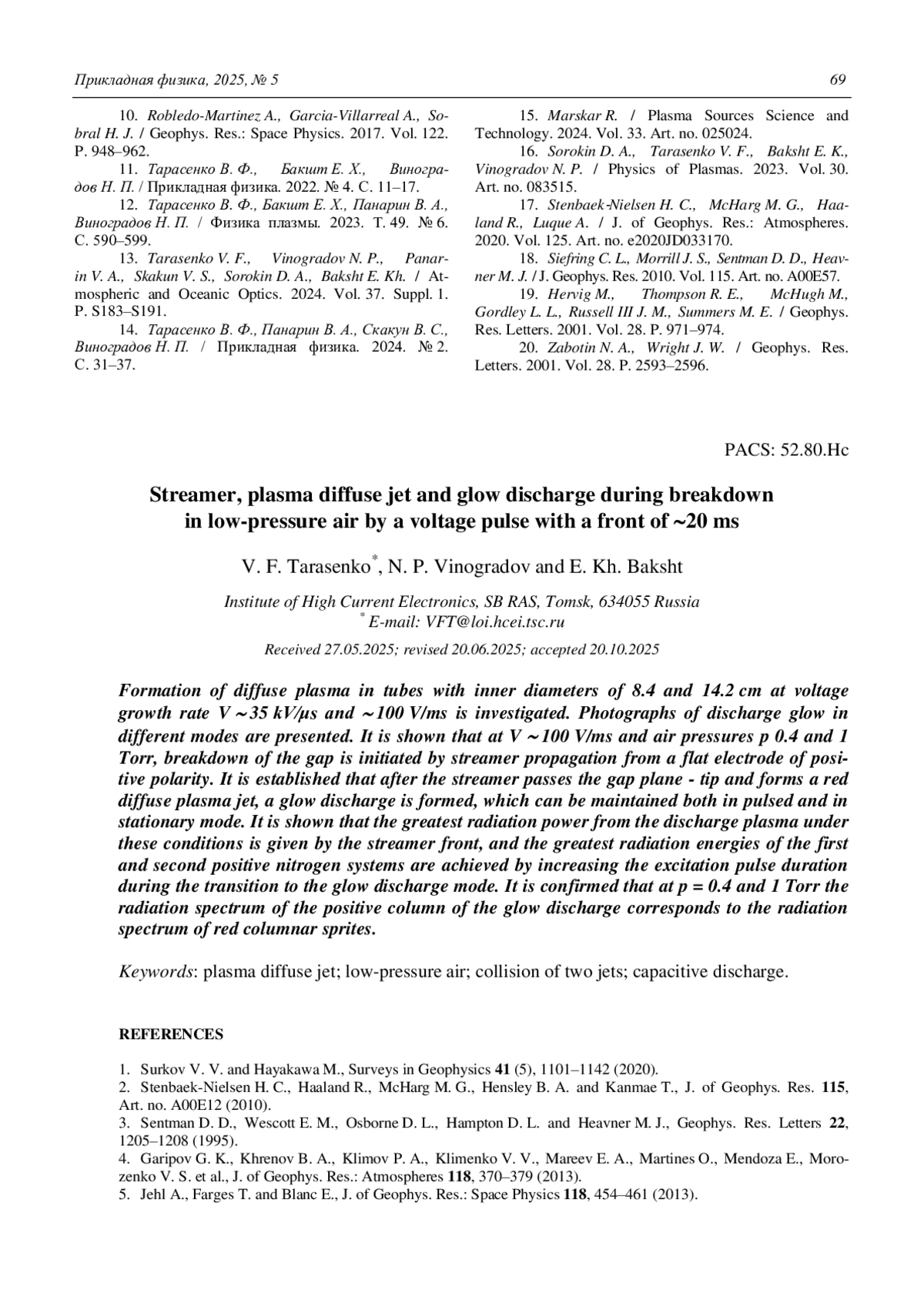 P. S183–S191. - Тарасенко В. Ф., Панарин В. А., Ска-кун В. С., Виноградов Н. П. / Прикладная физика. 2024. № 2. С. 31–37.
