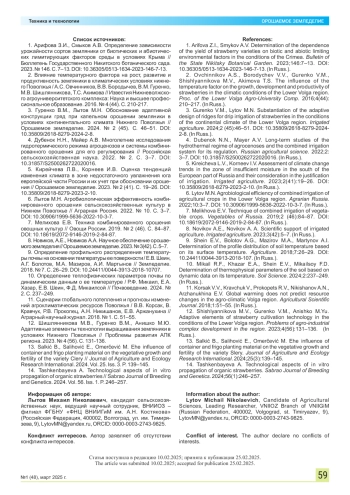 ЛЫТОВ М. Н. КОМБИНИРОВАННОЕ ОРОШЕНИЕ ДЛЯ РЕГУЛИРОВАНИЯ ТЕМПЕРАТУРНОГО ФАКТОРА ПРИ ПРОМЫШЛЕННОМ ВОЗДЕЛЫВАНИИ ЗЕМЛЯНИКИ В НИЖНЕМ ПОВОЛЖЬЕ // ОРОШАЕМОЕ ЗЕМЛЕДЕЛИЕ. 2025. № 1 (48)