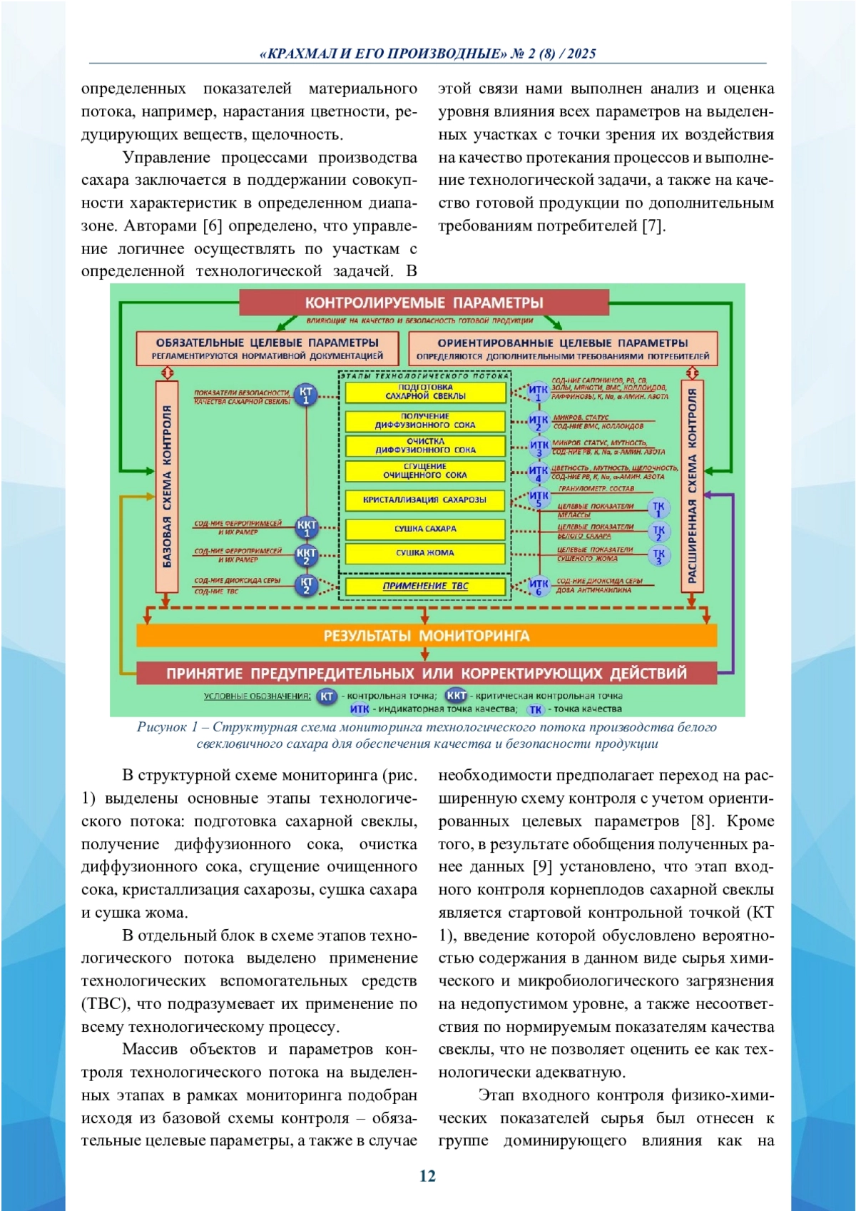 В современных условиях на пищевых предприятиях все большую значимость приобретает одновременное обеспечение безопасности и качества в виде интегрированного контроля технологического потока. Рассмотрены аспекты формирования структуры мониторинга технологического потока производства белого свекловичного сахара. Показана необходимость выделения контрольных точек, индикаторных точек качества, критических контрольных точек, которые в совокупности гарантируют поддержание качества и безопасности белого сахара. В системе мониторинга выделено 3 точки качества, 2 критические контрольные точки, 6 индикаторных точек качества. В качестве инструмента системы мониторинга предложен специализированный программный комплекс – сквозная контрольно-аналитическая система «Сахар» (СКАС «Сахар»).