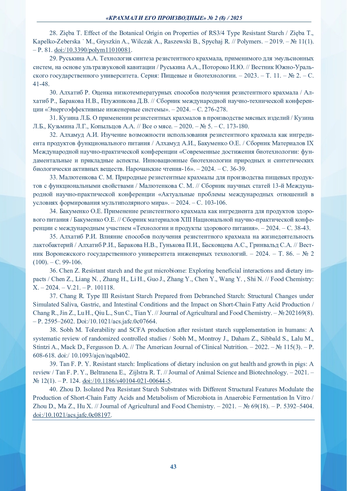 28. Zięba T. Effect of the Botanical Origin on Properties of R/4 Type Resistant Starch / Zięba T., Kapelko - Zeberska ˙ M., Gryszkin A., Wilczak A., Raszewski B., Spychaj R. // Polymers. - 2019. - № 11(1). - Р. 81. /. DOI: 10.3390/polym11010081
