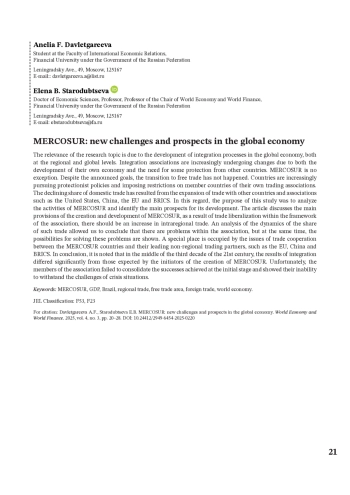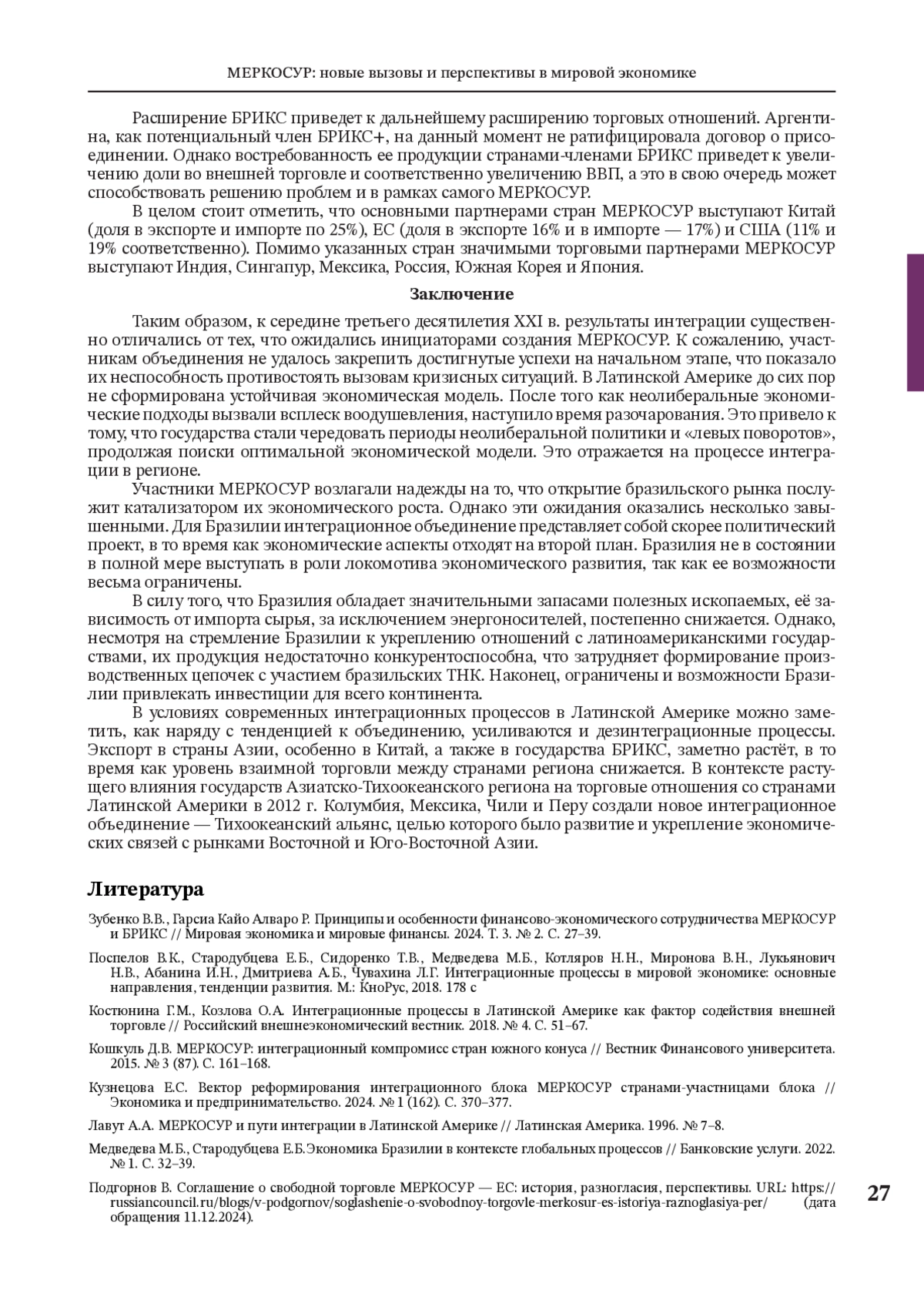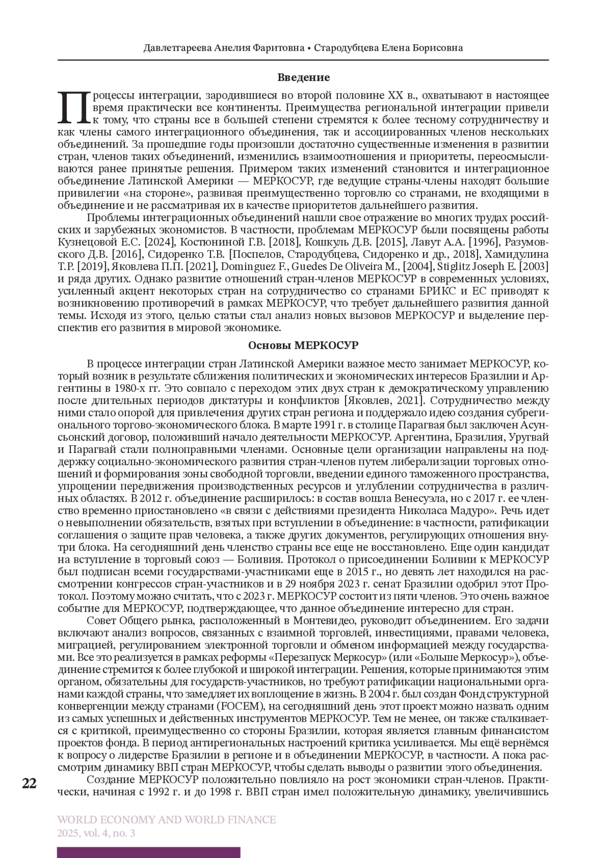 ДАВЛЕТГАРЕЕВА А. Ф., СТАРОДУБЦЕВА Е. Б. МЕРКОСУР: НОВЫЕ ВЫЗОВЫ И ПЕРСПЕКТИВЫ В МИРОВОЙ ЭКОНОМИКЕ // МИРОВАЯ ЭКОНОМИКА И МИРОВЫЕ ФИНАНСЫ. 2025. № 3, ТОМ 4