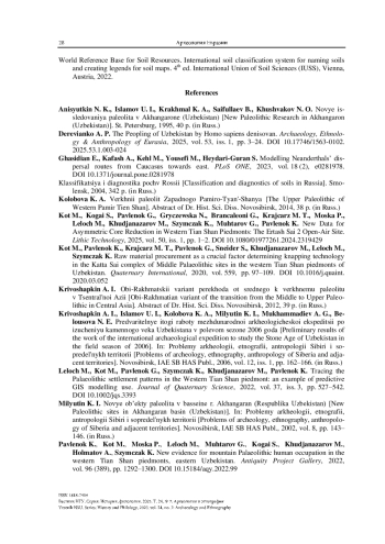 15. Pavlenok K., Kot M., Moska P., Leloch M., Muhtarov G., Kogai S., Khudjanazarov M., Holmatov A., Szymczak K. New evidence for mountain Palaeolithic human occupation in the western Tian Shan piedmonts, eastern Uzbekistan // Antiquity Project Gallery. 2022. Vol. 96 (389). P. 1292-1300. https://doi.org/10.15184/aqy.2022.99