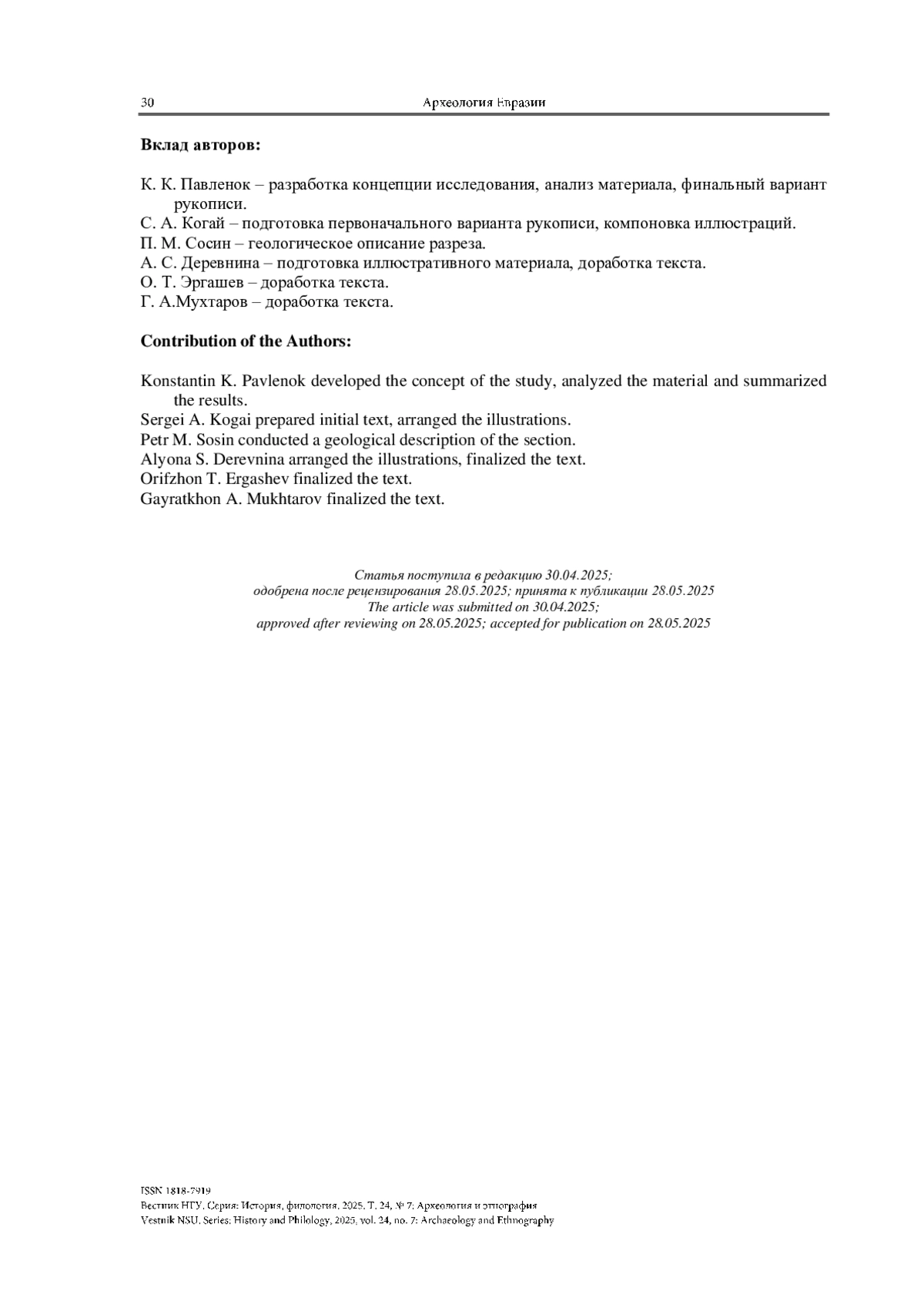 12. Kot M., Kogai S., Pavlenok G., Gryczewska N., Brancaleoni G., Krajcarz M. T., Moska P., Leloch M., Khudjanazarov M., Szymczak K., Muhtarov G., Pavlenok K. New Data for Asymmetric Core Reduction in Western Tian Shan Piedmonts: The Ertash Sai 2 Open-Air Site // Lithic Technology. 2025. Vol. 50, iss. 1. P. 1-2. https://doi.org/10.1080/01977261.2024.2319429