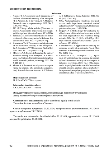 1. Антонов И. С. Оценка и прогнозирование уровня экономической безопасности предприятия / И. С. Антонов, К. С. Кривякин, Н. Н. Макаров // Экономика и предпринимательство. 2022. № 2 (139). 985-991 с. EDN: CBUZCP