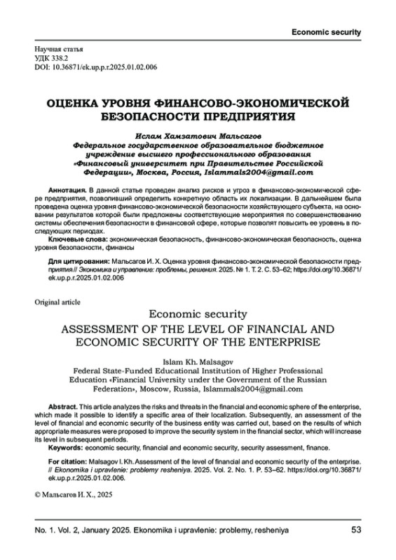 В данной статье проведен анализ рисков и угроз в финансово- экономической сфере предприятия, позволивший определить конкретную область их локализации. В дальнейшем была проведена оценка уровня финансово- экономической безопасности хозяйствующего субъекта, на основании результатов которой были предложены соответствующие мероприятия по совершенствованию системы обеспечения безопасности в финансовой сфере, которые позволят повысить ее уровень в последующих периодах.