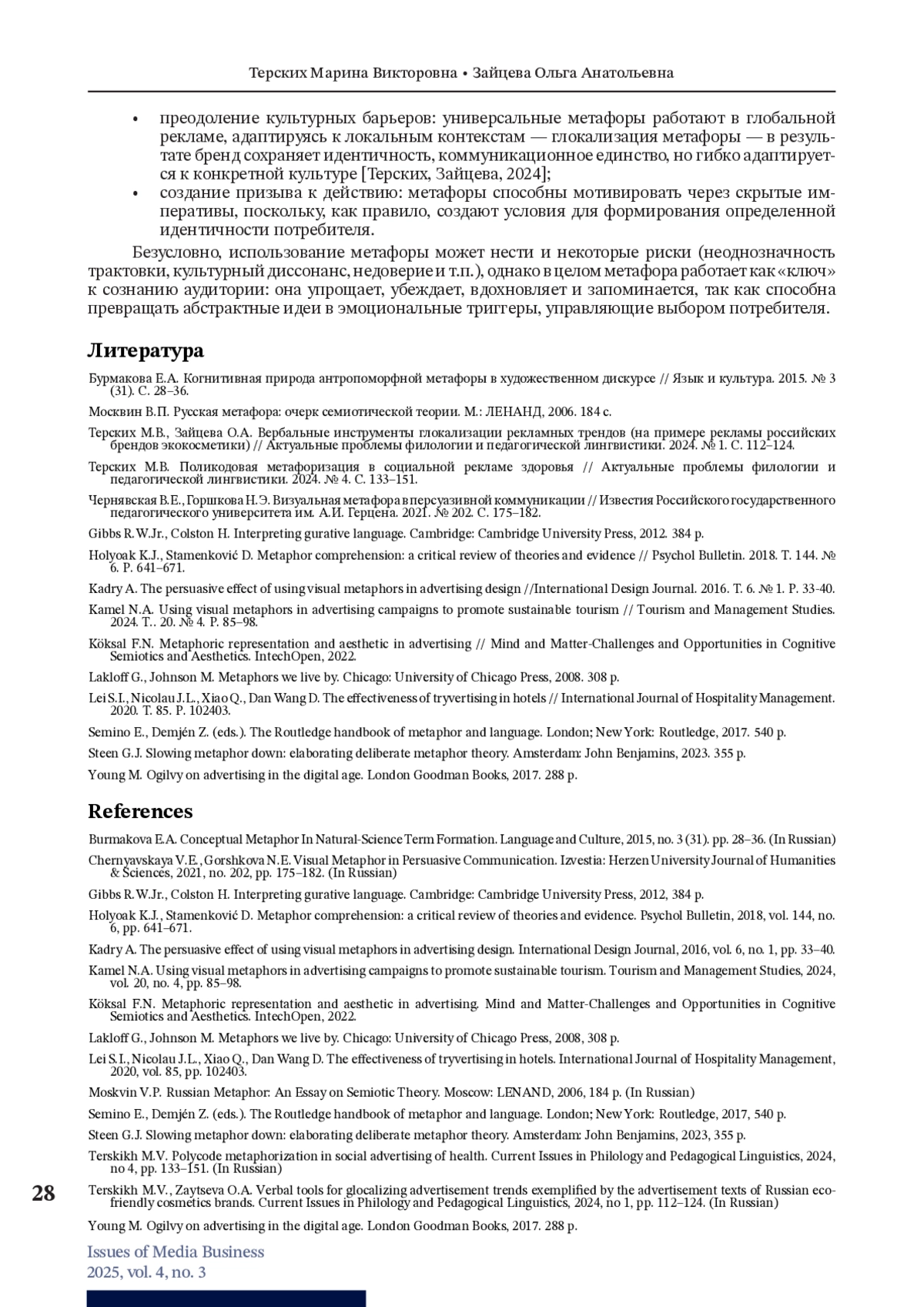 3. Терских М.В., Зайцева О.А. Вербальные инструменты глокализации рекламных трендов (на примере рекламы российских брендов экокосметики) // Актуальные проблемы филологии и педагогической лингвистики. 2024. № 1. С. 112-124.