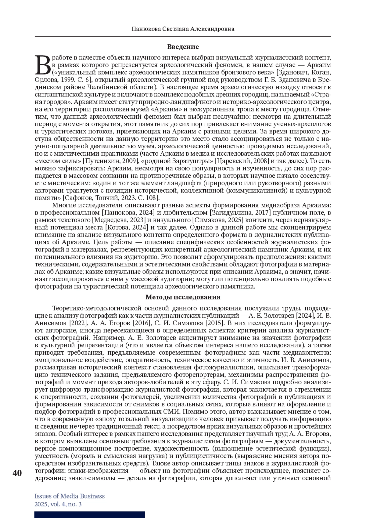 Статья описывает специфику репрезентации археологического памятника в фотографиях сетевых СМИ. В качестве примера выбран челябинский (Россия) исторический комплекс Аркаим. Приводятся схожие публикации по данной теме, обозначаются основные направления дискуссии об объекте исследования (освещение памятника как научного центра и места мистических практик одновременно) и степень изученности медиаобраза Аркаима в контексте исследований журналистского контента. Цель работы — описание специфических особенностей журналистских фотографий в материалах, репрезентующих конкретный археологический памятник Аркаим, и их потенциального влияния на аудиторию. Для этого была подробно проанализирована эмпирическая база исследования, состоящая из 128 журналистских публикаций с использованием 590 фотографий, собранных посредством платформы «Дзен» (dzen. ru). Данные материалы были опубликованы в период с 1 января по 31 декабря 2024 г. и рассказывают об Аркаиме широкой аудитории. Использовав методы контент-анализа, медиаэстетического и формально-содержательного анализов, мы рассмотрели указанные материалы по следующим критериям: технические характеристики, документальность, участники фотографий, уникальность, эмоциональная модальность, публицистичность, уместность. Проделанная работа позволила прийти к следующим выводам: фотографии, отобранные журналистами для публикаций об Аркаиме, отличаются своим высоким техническим качеством, имеют идентичные подходы к верстке и постобработке (авторы стремятся к естественности); участниками снимков становятся люди, культурные артефакты и природный ландшафт и лишь в последнюю очередь — археологические артефакты; большая часть фотографий имеет определенную эмоциональную модальность и формирует у аудитории определенное мнение по заявленному вопросу, подтверждает авторскую позицию; проанализированные снимки уместны в контексте заявленных инфоповодов. Это демонстрирует смещение фокуса в репрезентации археологического памятника (научный аспект не является превалирующим), а также формирование неочевидных ассоциативных связей у массовой аудитории с местом (не городище и раскопки, а фестиваль, горы, памятники и прочее).