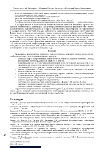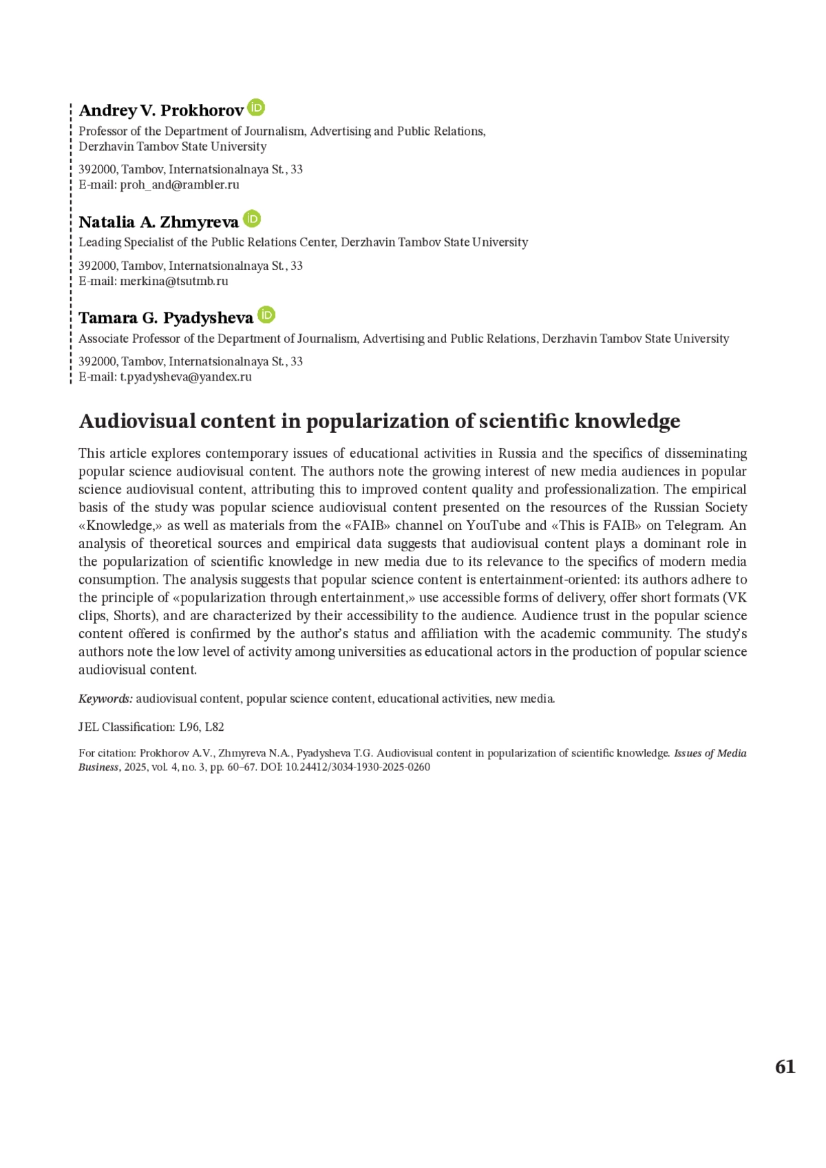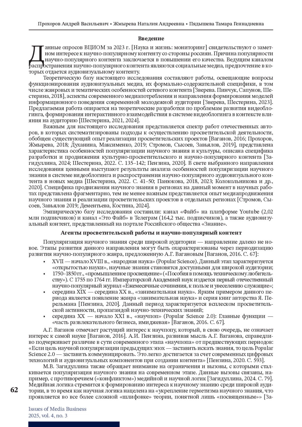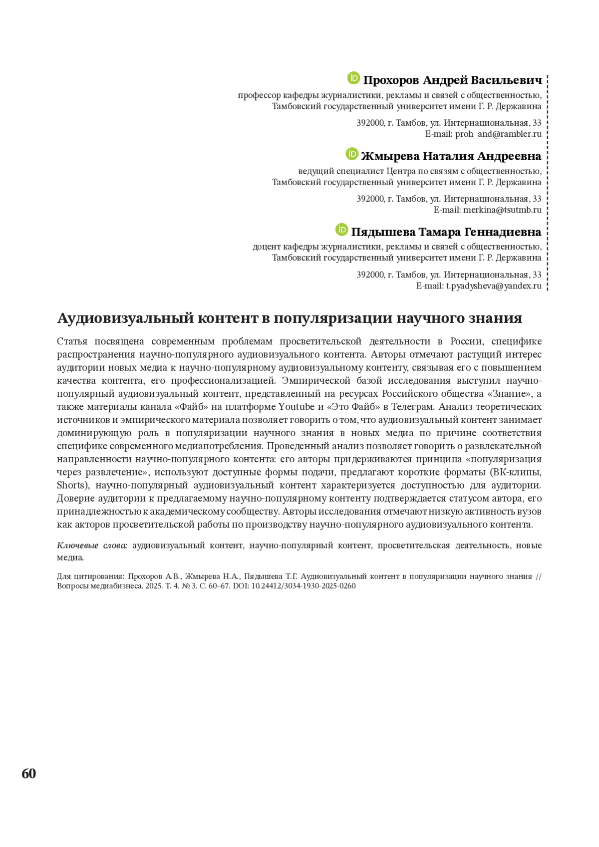 ПРОХОРОВ А. В., ЖМЫРЕВА Н. А., ПЯДЫШЕВА Т. Г. АУДИОВИЗУАЛЬНЫЙ КОНТЕНТ В ПОПУЛЯРИЗАЦИИ НАУЧНОГО ЗНАНИЯ // ВОПРОСЫ МЕДИАБИЗНЕСА. 2025. № 3, ТОМ 4
