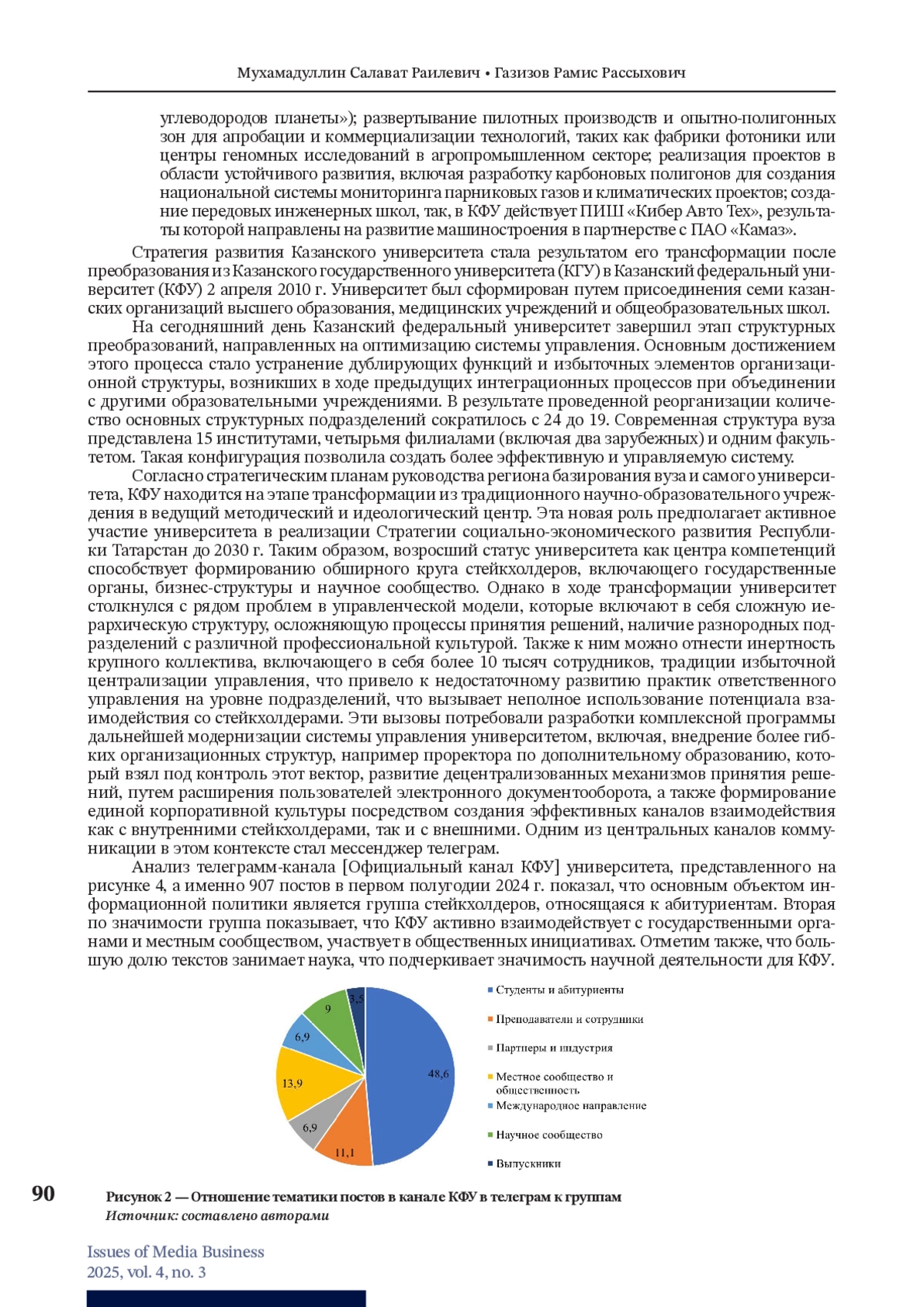 В статье рассматривается трансформация информационной политики современных российских университетов в условиях цифровизации медиасреды на примере Казанского и Уральского федеральных университетов. Исследование фокусируется на анализе стратегий взаимодействия со стейкхолдерами через различные уровни коммуникации (корпоративный, региональный, национальный и международный) и цифровые каналы, включая социальные сети и мессенджеры. На основе контент-анализа Telegram-каналов Казанского (Приволжского) федерального и Уральского федерального университетов выявлены информационные приоритеты вузов, направленные на работу с внутренней аудиторией при недостаточной системности взаимодействия с внешними стейкхолдерами. Также представлен обзор нормативно-правовой базы, регулирующей информационную политику в сфере высшего образования, включая Конституцию России и Доктрину информационной безопасности, положения о структурах образовательных учреждений и организаций, подведомственных Министерству науки и высшего образования России. Анализируется влияние государственных инициатив, например, составной части национального проекта «Наука и университеты» программы «Приоритет 2030», на формирование медиастратегий университетов. Рассматривается трансформация организационных структур управления информационной политикой в условиях институциональных преобразований вузов. Особое внимание уделяется роли миссии университета как смыслового ядра его информационной политики и инструмента формирования бренда в медиапространстве. Авторы выявляют ключевые тенденции в медиакоммуникациях вузов: переход от традиционных медиа к цифровым платформам, усиление роли визуального контента, необходимость адаптации коммуникационных стратегий под различные целевые аудитории. На основе анализа контента официальных университетских каналов демонстрируется преобладание внутренней коммуникации (студенты, преподаватели, сотрудники) при сохраняющемся дефиците системного взаимодействия с внешними стейкхолдерами. В работе подчеркиваются основные управленческие вызовы: сложность координации многоуровневой структуры коммуникаций, недостаточная обратная связь от целевых аудиторий, необходимость интеграции цифровых инструментов в стратегическое управление информационной политикой. Авторы предлагают направления совершенствования университетских медиакоммуникаций, включая развитие гибких моделей управления, внедрение цифровых технологий мониторинга эффективности, создание сквозных коммуникационных процессов и усиление международного присутствия. Исследование вносит вклад в понимание эволюции информационной политики вузов в цифровую эпоху и представляет практическую ценность для администраций университетов, разрабатывающих современные стратегии медиакоммуникаций.