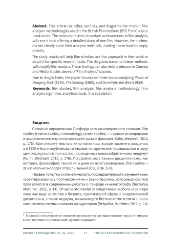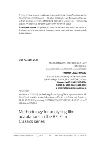 Статья посвящена выявлению, изложению, а также отображению в виде схем алгоритмов анализа фильма, применяемых авторами книг серии «Классика», издаваемых Британским институтом кино (BFI). Серия «BFI Film Classics» - чрезвычайно важное достижение в области анализа фильма: каждая книга представляет собой обстоятельный разбор одного кинематографического произведения. Однако, анализируя фильмы, авторы не артикулируют используемый инструментарий, что затрудняет его применение другими киноведами. Результаты настоящего исследования позволят ученым использовать примененные авторами книг инструменты при анализе фильмов, в случае необходимости адаптировав их для тех или иных исследовательских задач. Созданные на основе вычлененных алгоритмов разбора схемы существенно упростят процедуру анализа. Полученные данные могут быть использованы преподавателями киношкол и факультетов экранных искусств при разработке курса «Анализ фильма». В силу ограниченности объема в данной статье подробно рассматриваются три исследования - тексты, посвященные фильмам «Пикник у Висячей скалы» (Picnic at Hanging Rock, 1975), «Сияние» (The Shining, 1980) и «Унесенные ветром» (Gone With the Wind, 1939).