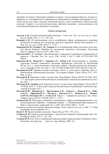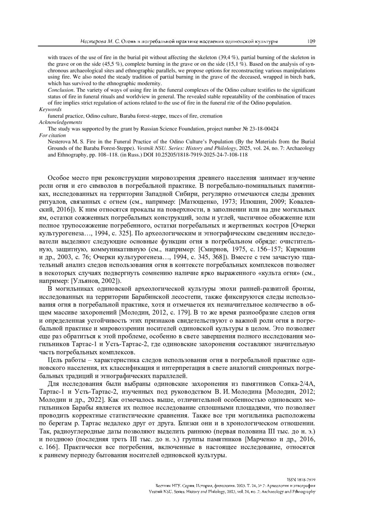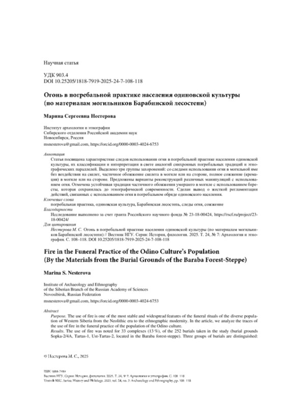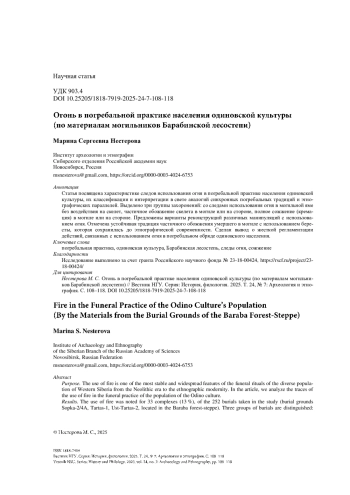 НЕСТЕРОВА М. С. ОГОНЬ В ПОГРЕБАЛЬНОЙ ПРАКТИКЕ НАСЕЛЕНИЯ ОДИНОВСКОЙ КУЛЬТУРЫ (ПО МАТЕРИАЛАМ МОГИЛЬНИКОВ БАРАБИНСКОЙ ЛЕСОСТЕПИ) // ВЕСТНИК НГУ. СЕРИЯ: ИСТОРИЯ, ФИЛОЛОГИЯ. 2025. ТОМ 24, № 7