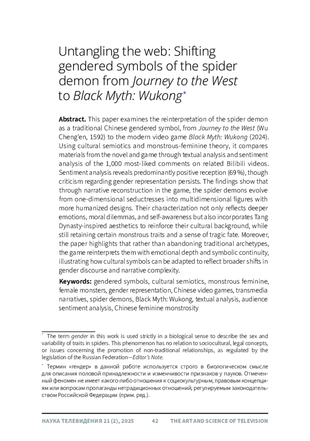 В данной статье рассматривается переосмысление образа демона-паука как традиционного китайского гендерного символа, начиная с романа «Путешествие на Запад» (У Чэнъэнь, 1592) и заканчивая современной видеоигрой «Черный миф: Укун» (2024). Используя культурную семиотику и теорию чудовищно-женственного, авторы сравнивают материалы романа и игры посредством текстового анализа и анализа тональности 1000 наиболее популярных комментариев к связанным видеороликам Bilibili. Анализ тональности показывает преимущественно положительный прием (69%), хотя критика гендерной репрезентации сохраняется. Результаты показывают, что благодаря нарративной реконструкции в игре демоны-пауки превращаются из одномерных соблазнительниц в многомерные фигуры с более человечным внешним видом. Их образы не только отражают глубокие эмоции, моральные дилеммы и самосознание, но и включают в себя эстетику, вдохновленную династией Тан, для усиления их культурного контекста, сохраняя при этом определенные чудовищные черты и ощущение трагической судьбы. Более того, в статье подчеркивается, что вместо того, чтобы отказываться от традиционных архетипов, игра переосмысливает их с эмоциональной глубиной и символической преемственностью, иллюстрируя, как культурные символы могут быть адаптированы для отражения более широких изменений в гендерном дискурсе и сложности повествования.
