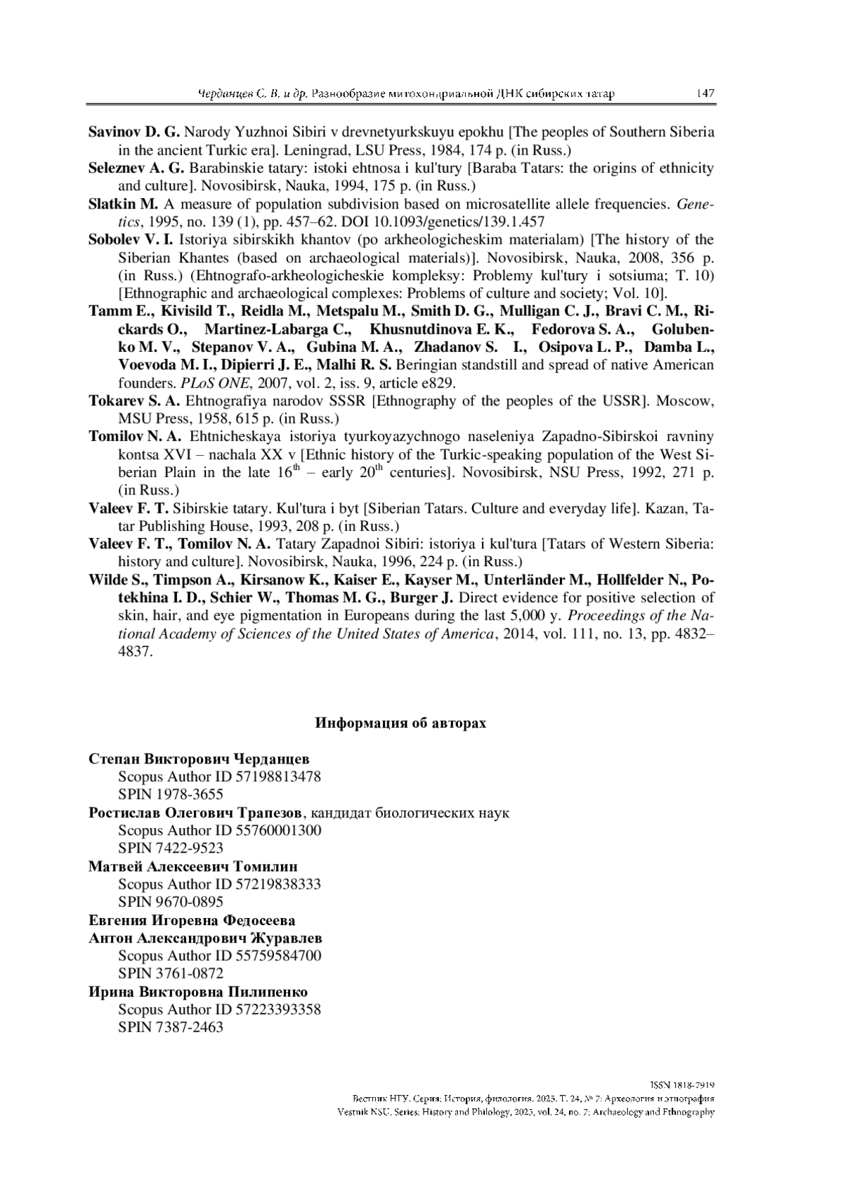 ЧЕРДАНЦЕВ С. В., ТРАПЕЗОВ Р. О., ТОМИЛИН М. А., ФЕДОСЕЕВА Е. И., ЖУРАВЛЕВ А. А., ПИЛИПЕНКО И. В., РЫКУН М. П., МОЛОДИН В. И., ПИЛИПЕНКО А. С. РАЗНООБРАЗИЕ МИТОХОНДРИАЛЬНОЙ ДНК СИБИРСКИХ ТАТАР ИЗ ПОЗДНЕСРЕДНЕВЕКОВОГО МОГИЛЬНИКА АБРАМОВО-10 (БАРАБИНСКАЯ ЛЕСОСТЕПЬ) // ВЕСТНИК НГУ. СЕРИЯ: ИСТОРИЯ, ФИЛОЛОГИЯ. 2025. ТОМ 24, № 7