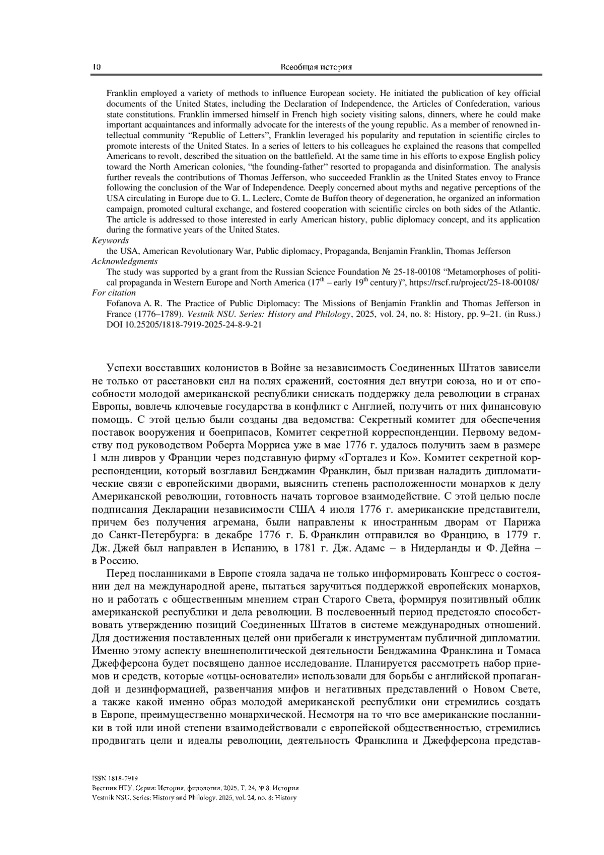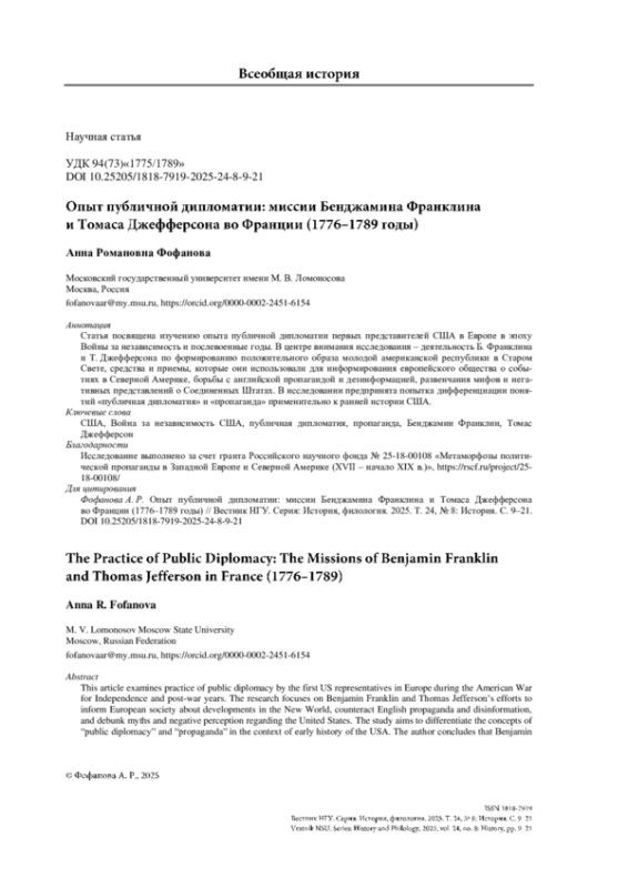 3. Фофанова А. Р. Бенджамин Франклин - первый публичный дипломат в истории Соединенных Штатов Америки // Молодой ученый. Международный научный журнал. 2021. № 46. С. 242-244.