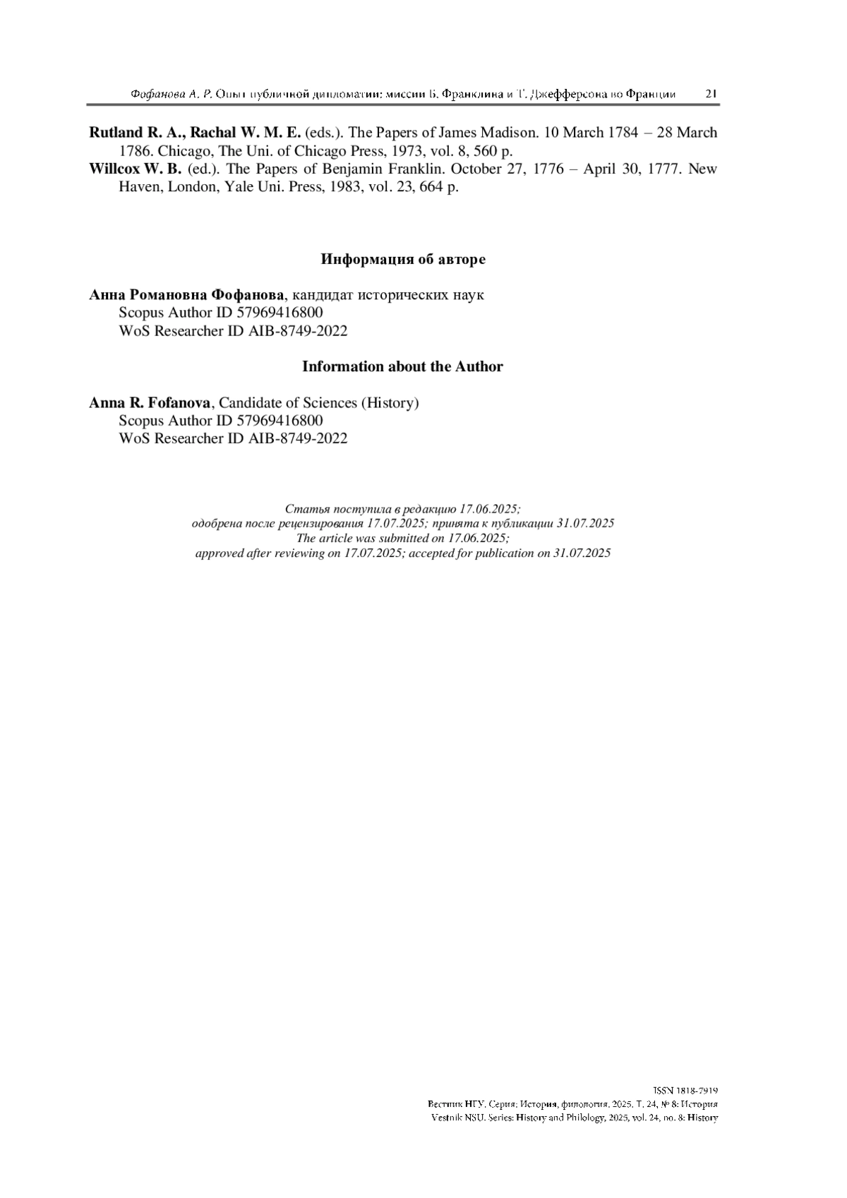 4. Фофанова А. Р. Томас Джефферсон: опыт публичной дипломатии в первые годы независимости Соединенных Штатов // Молодой ученый. Международный научный журнал. 2022. № 21. С. 657-659.