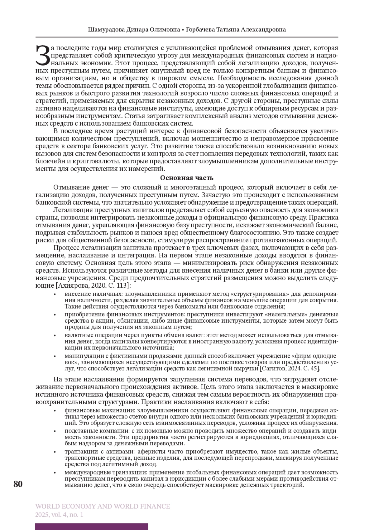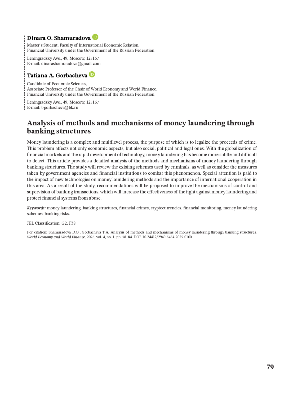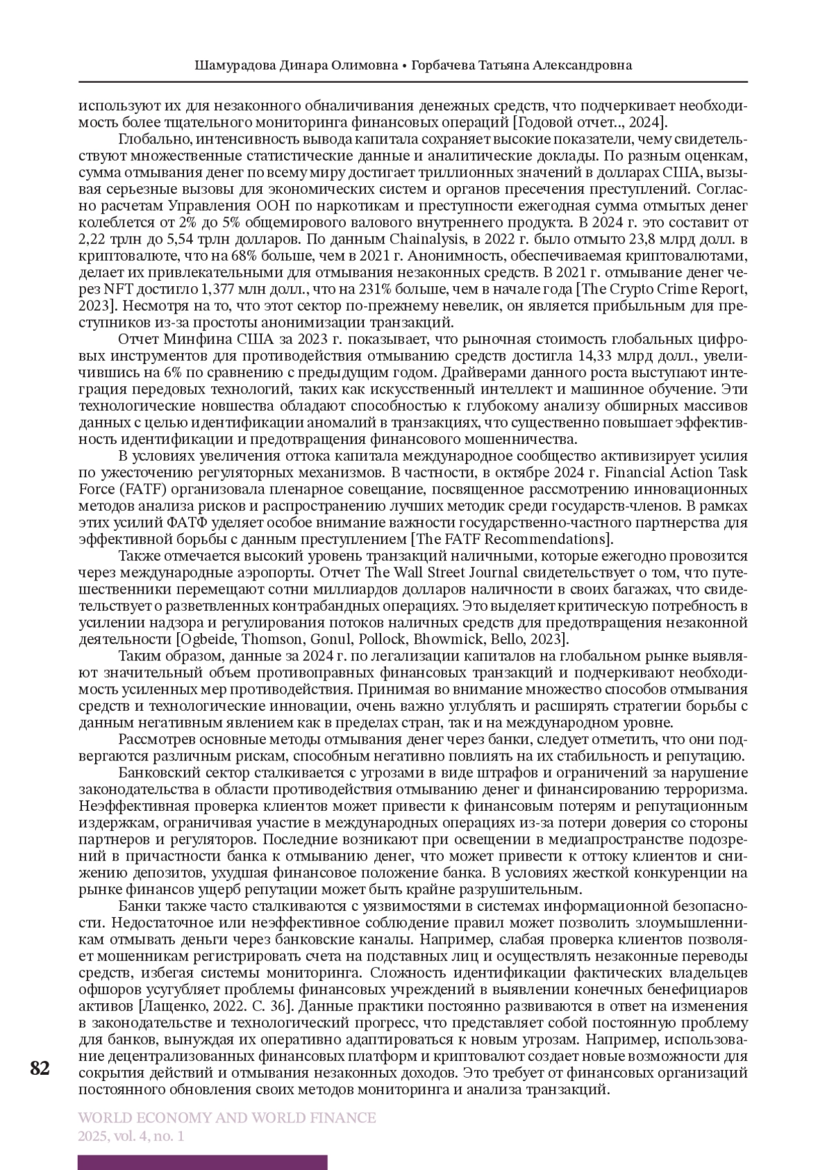 ШАМУРАДОВА Д. О., ГОРБАЧЕВА Т. А. АНАЛИЗ МЕТОДОВ И МЕХАНИЗМОВ ОТМЫВАНИЯ ДЕНЕГ ЧЕРЕЗ БАНКОВСКИЕ СТРУКТУРЫ // МИРОВАЯ ЭКОНОМИКА И МИРОВЫЕ ФИНАНСЫ. 2025. № 1, ТОМ 4