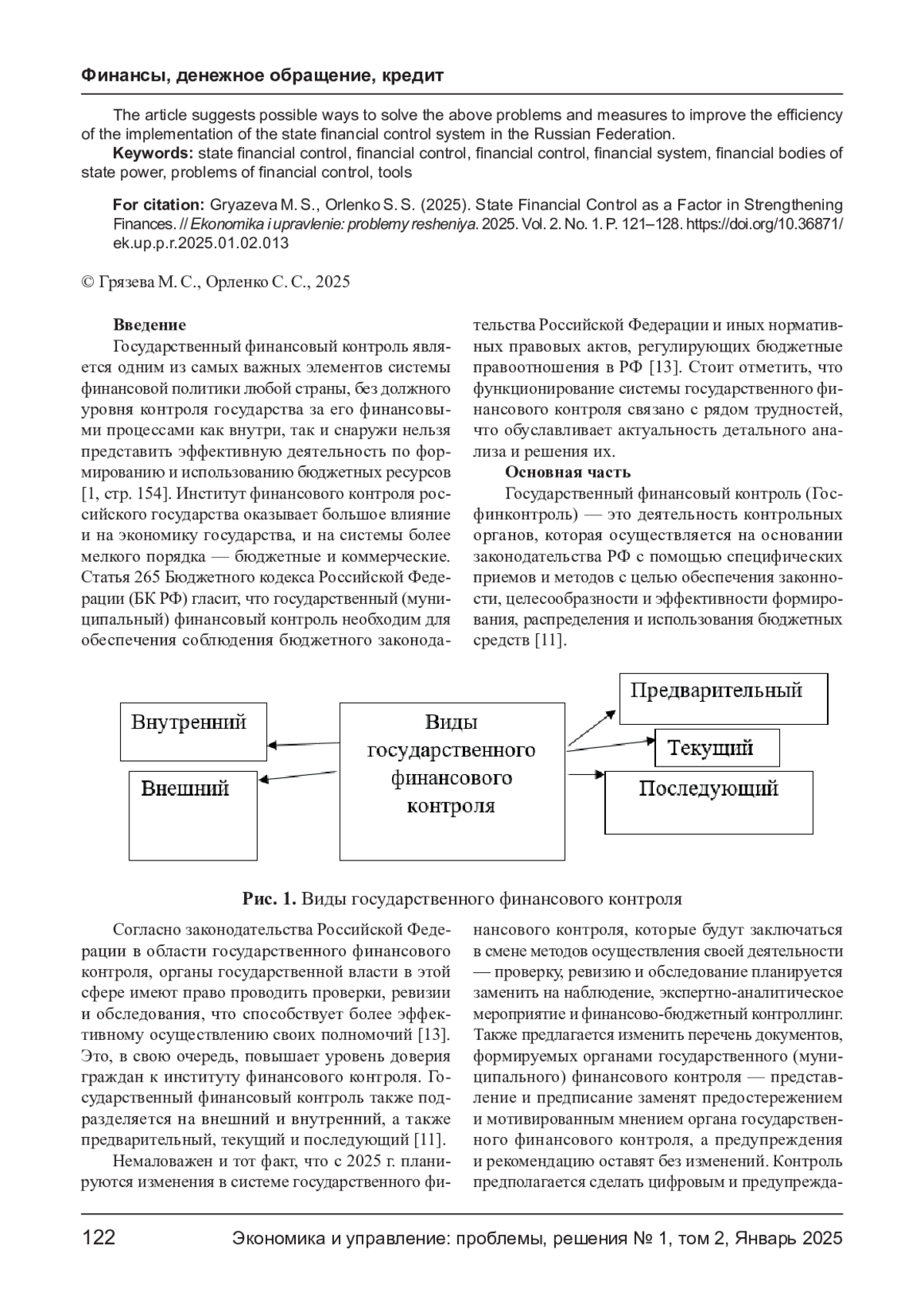 В работе исследованы актуальные проблемы функционирования системы государственного финансового контроля в Российской Федерации. На основе анализа текущего законодательства, статистических и аналитических данных рассмотрены ключевые аспекты и этапы государственного финансового контроля. Особое внимание уделяется вопросам отсутствия единого нормативно-правового акта, устанавливающего процесс осуществления государственного финансового контроля, отсутствия единого подхода к осуществлению деятельности контрольных органов государственной власти, взаимодействия с другими государственными органами, гражданами и СМИ, недостаточного уровня компетенции государственных служащих, а также наличия коллизионных норм законодательства в области государственного финансового контроля.