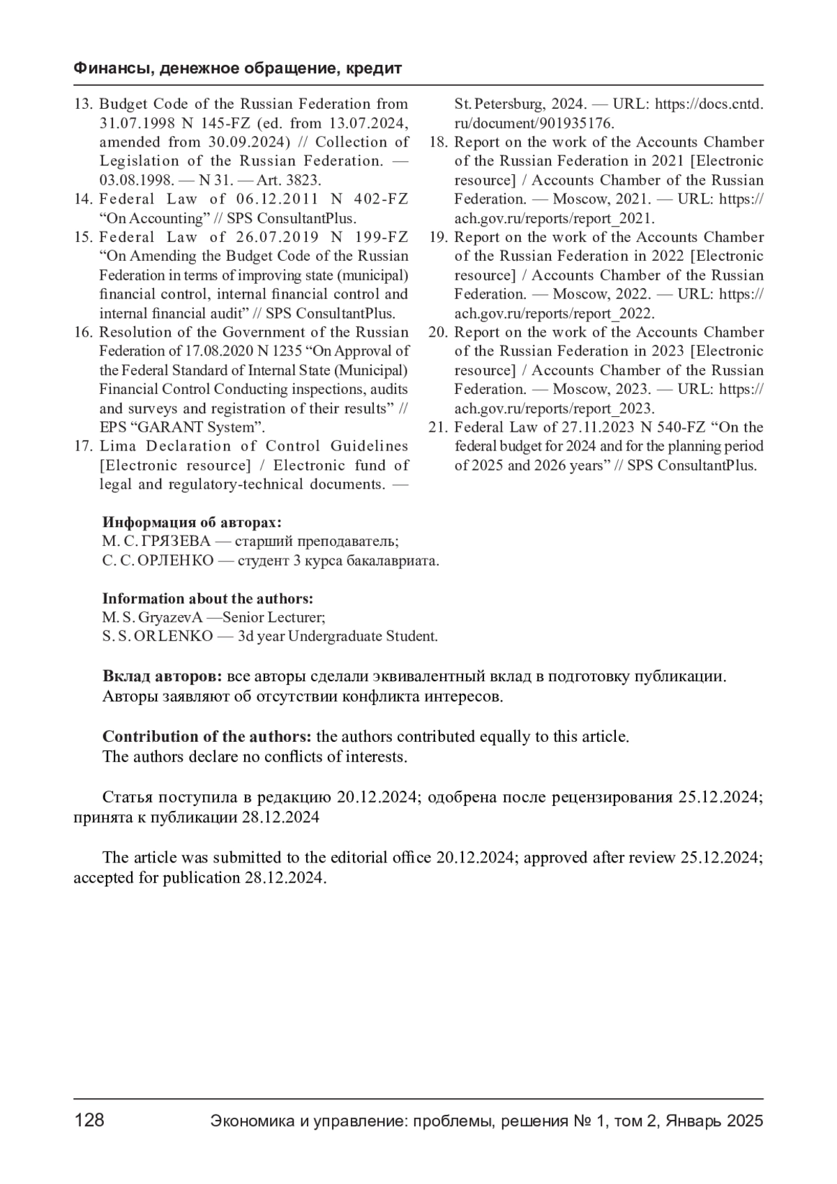 8. Сеитов Д. А. Государственный финансовый контроль в бюджетной сфере России / Д. А. Сеитов. - Текст: непосредственный // Молодой ученый. - 2021. - № 49 (391). - С. 268-272. - URL: https://moluch.ru/archive/391/86254/(дата обращения: 23.12.2024). EDN: YELNQZ