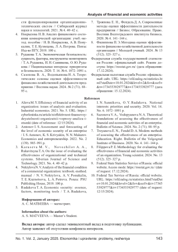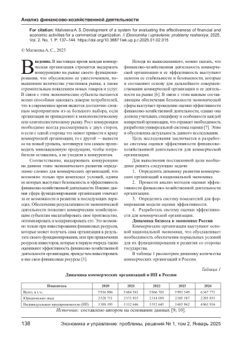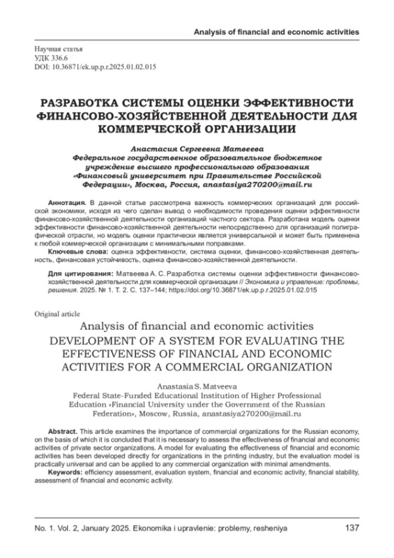 МАТВЕЕВА А. С. РАЗРАБОТКА СИСТЕМЫ ОЦЕНКИ ЭФФЕКТИВНОСТИ ФИНАНСОВО-ХОЗЯЙСТВЕННОЙ ДЕЯТЕЛЬНОСТИ ДЛЯ КОММЕРЧЕСКОЙ ОРГАНИЗАЦИИ // ЭКОНОМИКА И УПРАВЛЕНИЕ: ПРОБЛЕМЫ, РЕШЕНИЯ. 2025. ТОМ 2 № 1