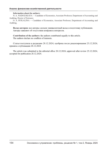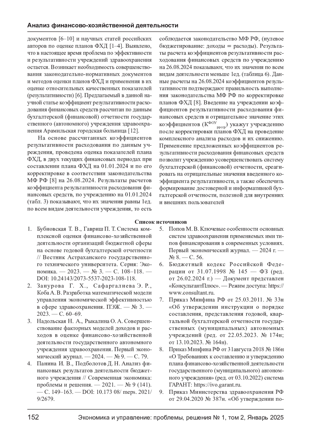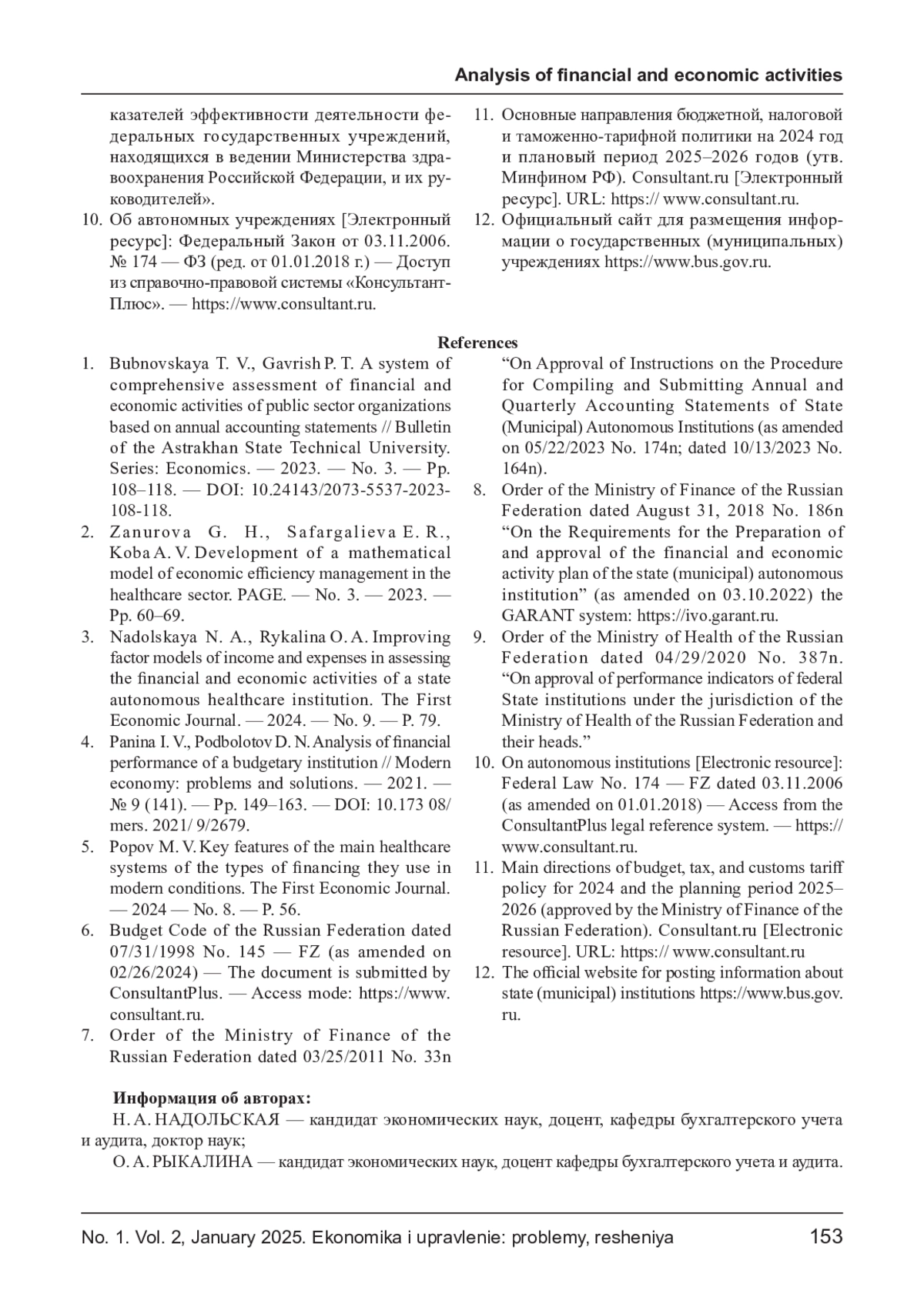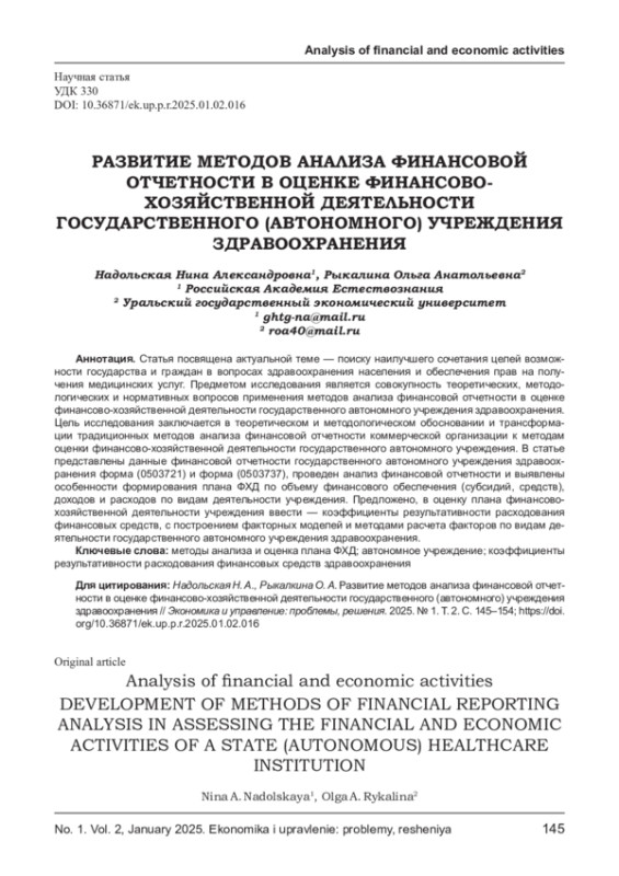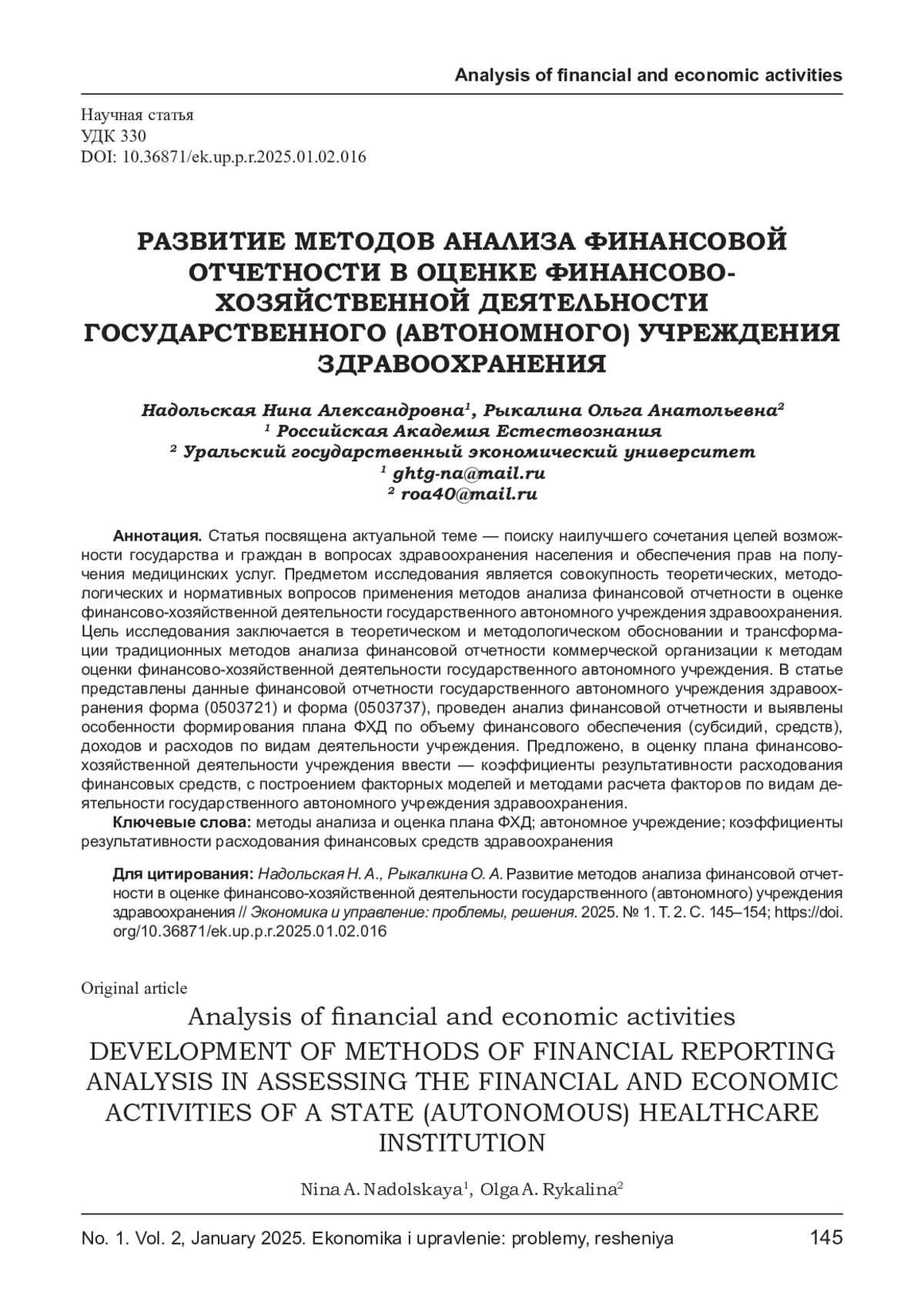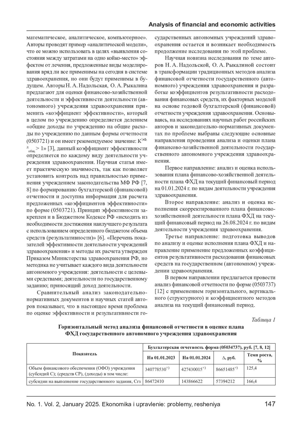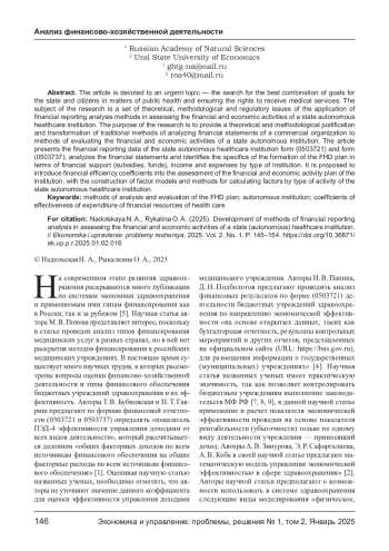 НАДОЛЬСКАЯ Н. А., РЫКАЛИНА О. А. РАЗВИТИЕ МЕТОДОВ АНАЛИЗА ФИНАНСОВОЙ ОТЧЕТНОСТИ В ОЦЕНКЕ ФИНАНСОВО- ХОЗЯЙСТВЕННОЙ ДЕЯТЕЛЬНОСТИ ГОСУДАРСТВЕННОГО (АВТОНОМНОГО) УЧРЕЖДЕНИЯ ЗДРАВООХРАНЕНИЯ // ЭКОНОМИКА И УПРАВЛЕНИЕ: ПРОБЛЕМЫ, РЕШЕНИЯ. 2025. ТОМ 2 № 1