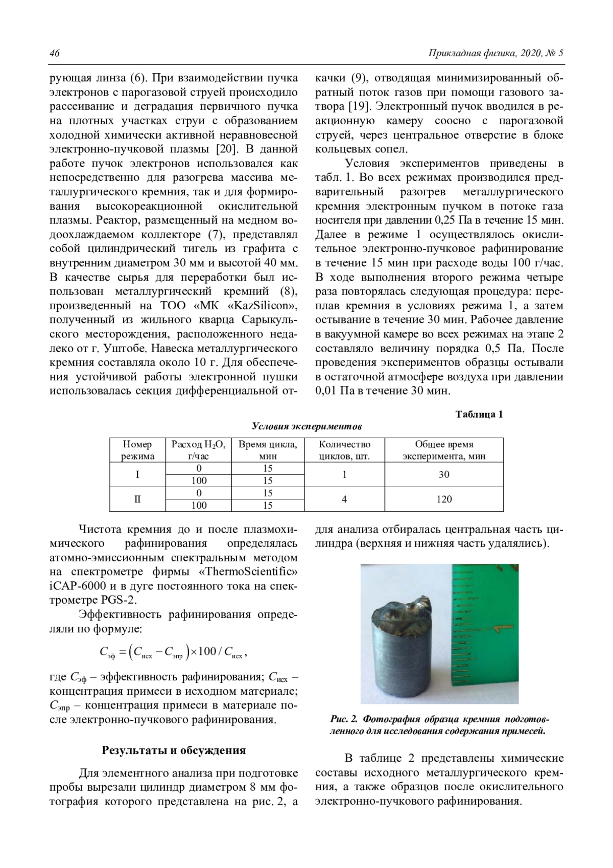 Разработано устройство для рафинирования металлургического кремния в плазме электронного пучка в сверхзвуковом потоке газа. Представлено описание и демонстрация возможностей электронно-пучкового метода и плазмы на его основе для удаления примесей из металлургического кремния в условиях форвакуумного диапазона давлений. На лабораторном оборудовании получены образцы кремния в варианте окислительного рафинирования с использованием паров воды.