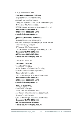 5. Журавлева, А.А. (2020). Аудиовизуальная журналистика и технологии искусственного интеллекта: телерадиожурналисты VS дикторы на базе нейросетей. В А.А. Морозова (Ред.). МЕДИАОбразование: медиа как тотальная повседневность (стр. 310-315). Челябинск: Челябинский государственный университет. EDN: KLEJVW