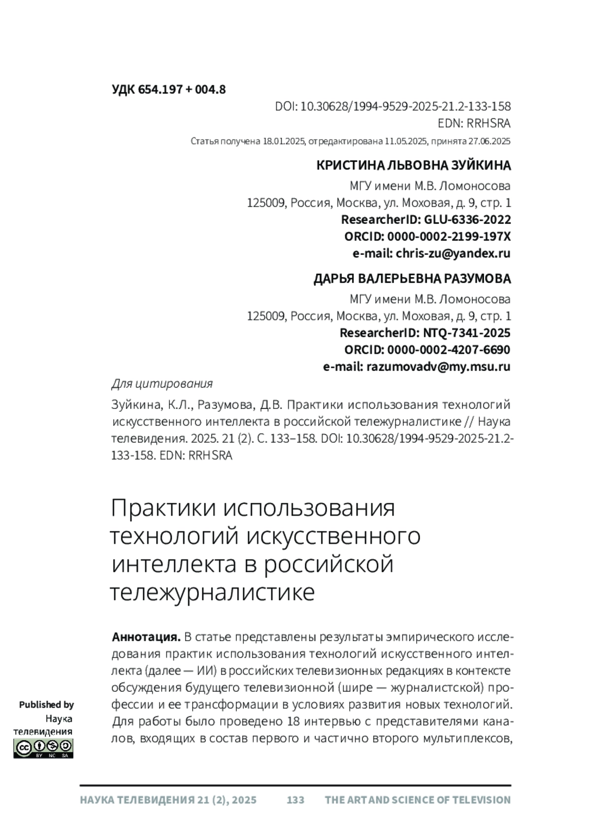В статье изложены результаты эмпирических исследований практики использования технологий искусственного интеллекта (далее - ИИ) в российских телевизионных редакциях в двадцатых дискуссиях будущей телевизионной (шире - журналистской) профессии и ее трансформации в условиях развития новых технологий. Для работы было проведено 18 интервью с направлениями, входящими в состав первого и частично второго мультиплексов, т. е. е. обязательных общедоступных телеканалов телевидения. Результаты исследования показывают, что сотрудники телевизионных редакций в силе профессиональных специалистов решают с помощью ИИ ряд достаточно тривиальных задач, что позволяет оптимизировать работу редакции и ускорить процесс редактирования. Одной из важных проблем применения технологии ИИ являются вопросы этики и авторского права, которые решаются в каждой редакции по-своему. Многие информанты основаны на создании внутриредакционных стандартов работы с технологиями ИИ и закреплении правил работы с новыми технологиями на законодательном уровне. По мере вероятной трансформации телевизионных участников исследования отдельных направлений оптимизации и ускорения некоторых «механических» процессов, благодаря чему журналисты концентрируются на создании более качественного и эксклюзивного контента. Среди возможных негативных последствий развития технологий ИИ в работе редактирования: увеличение скорости рабочих процессов, что может сказаться на повышении уровня стресса журналистов; увеличение количества фейковых новостей, сгенерированных ИИ; здоровая творческая профессия.