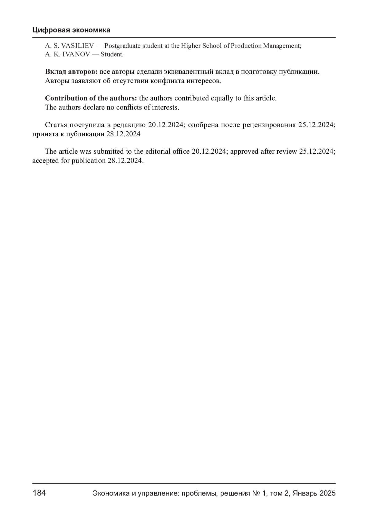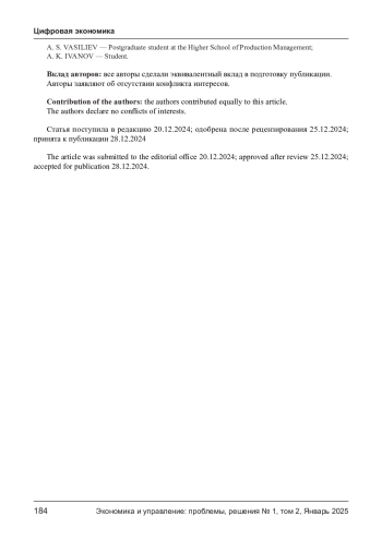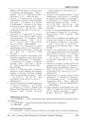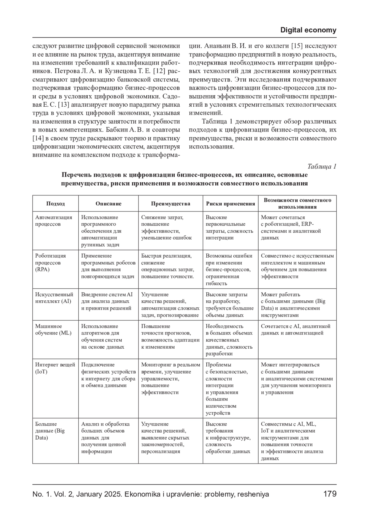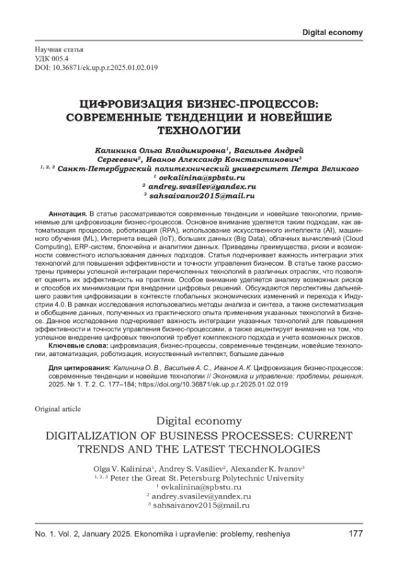 КАЛИНИНА О. В., ВАСИЛЬЕВ А. С., ИВАНОВ А. К. ЦИФРОВИЗАЦИЯ БИЗНЕС-ПРОЦЕССОВ: СОВРЕМЕННЫЕ ТЕНДЕНЦИИ И НОВЕЙШИЕ ТЕХНОЛОГИИ // ЭКОНОМИКА И УПРАВЛЕНИЕ: ПРОБЛЕМЫ, РЕШЕНИЯ. 2025. ТОМ 2 № 1