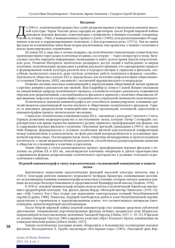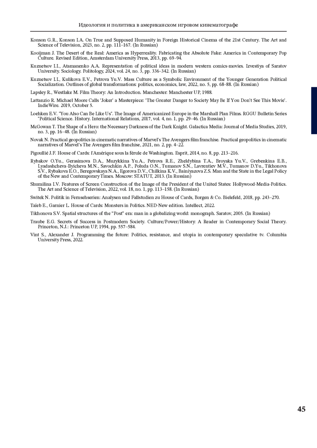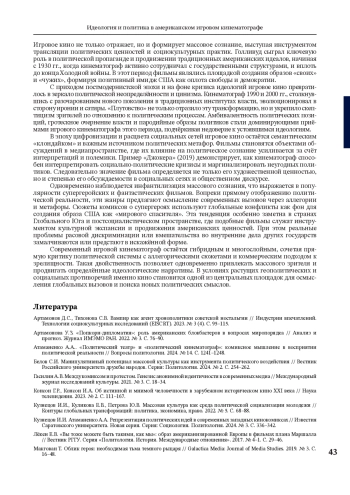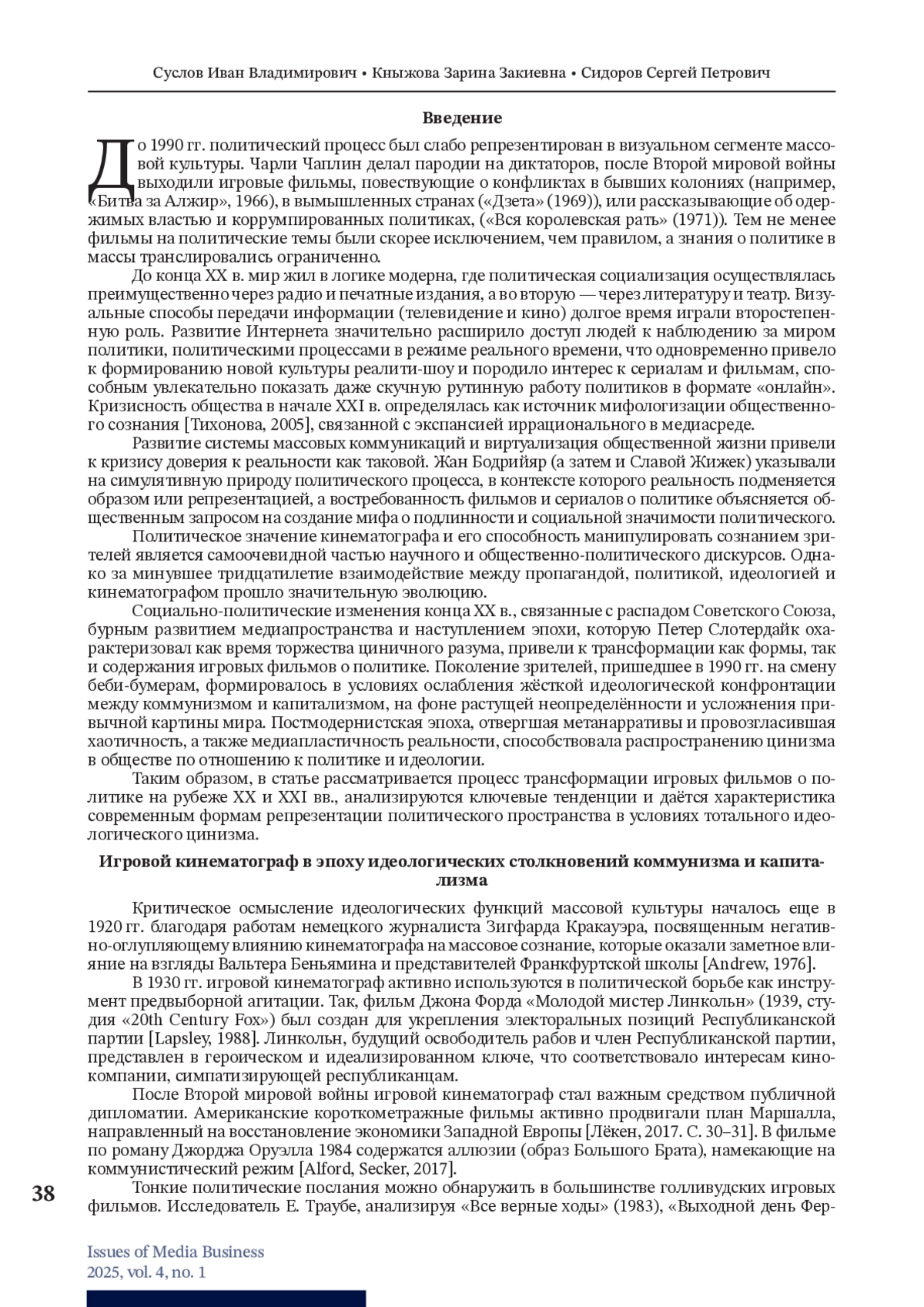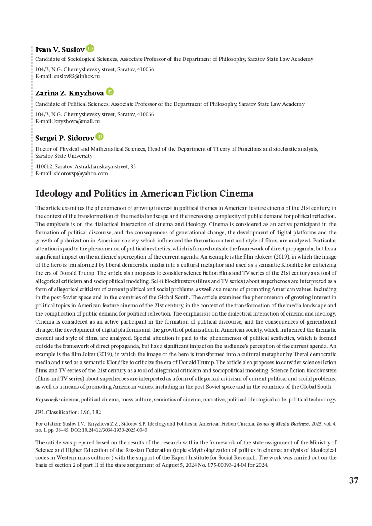 СУСЛОВ И. В., КНЫЖОВА З. З., СИДОРОВ С. П. ИДЕОЛОГИЯ И ПОЛИТИКА В АМЕРИКАНСКОМ ИГРОВОМ КИНЕМАТОГРАФЕ // ВОПРОСЫ МЕДИАБИЗНЕСА. 2025. № 1, ТОМ 4