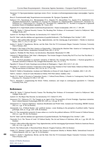 В статье исследуется феномен рост интереса к политическим темам в американском игровом кинематографе XXI в., в условиях трансформации медиапейзажа и усложнения общественного запроса на политическую рефлексию. Акцент сделан на диалектическом взаимодействии кино и идеологии. Кино рассматривается как активный участник формирования политического дискурса, а также анализируются последствия смены поколений, развитие цифровых платформ и рост поляризации в американском обществе, повлиявшие на тематическое наполнение и стилистику фильмов. Отдельное внимание уделено феномену политической эстетики, формирующейся вне рамок прямой пропаганды, но оказывающей значительное влияние на восприятие зрителями актуальной повестки. Примером служит фильм «Джокер» (2019), в котором образ героя либерально-демократическими медиа трансформирован в культурную метафору и используется как семантический клондайк для критики эпохи правления Дональда Трампа. В статье также предлагается рассматривать фантастические фильмы и сериалы XXI в. как инструмент иносказательной критики и социополитического моделирования. Фантастические блокбастеры (фильмы и сериалы) о супергероях интерпретируются как форма иносказательной критики актуальных политических и социальных проблем, а также средство продвижения американских ценностей, в том числе на постсоветском пространстве и в странах Глобального Юга. В статье исследуется феномен рост интереса к политическим темам в американском игровом кинематографе XXI в., в условиях трансформации медиапейзажа и усложнения общественного запроса на политическую рефлексию. Акцент сделан на диалектическом взаимодействии кино и идеологии. Кино рассматривается как активный участник формирования политического дискурса, а также анализируются последствия смены поколений, развитие цифровых платформ и рост поляризации в американском обществе, повлиявшие на тематическое наполнение и стилистику фильмов. Отдельное внимание уделено феномену политической эстетики, формирующейся вне рамок прямой пропаганды, но оказывающей значительное влияние на восприятие зрителями актуальной повестки. Примером служит фильм «Джокер» (2019), в котором образ героя либерально-демократическими медиа трансформирован в культурную метафору и используется как семантический клондайк для критики эпохи правления Дональда Трампа. В статье также предлагается рассматривать фантастические фильмы и сериалы XXI в. как инструмент иносказательной критики и социополитического моделирования. Фантастические блокбастеры (фильмы и сериалы) о супергероях интерпретируются как форма иносказательной критики актуальных политических и социальных проблем, а также средство продвижения американских ценностей, в том числе на постсоветском пространстве и в странах Глобального Юга.