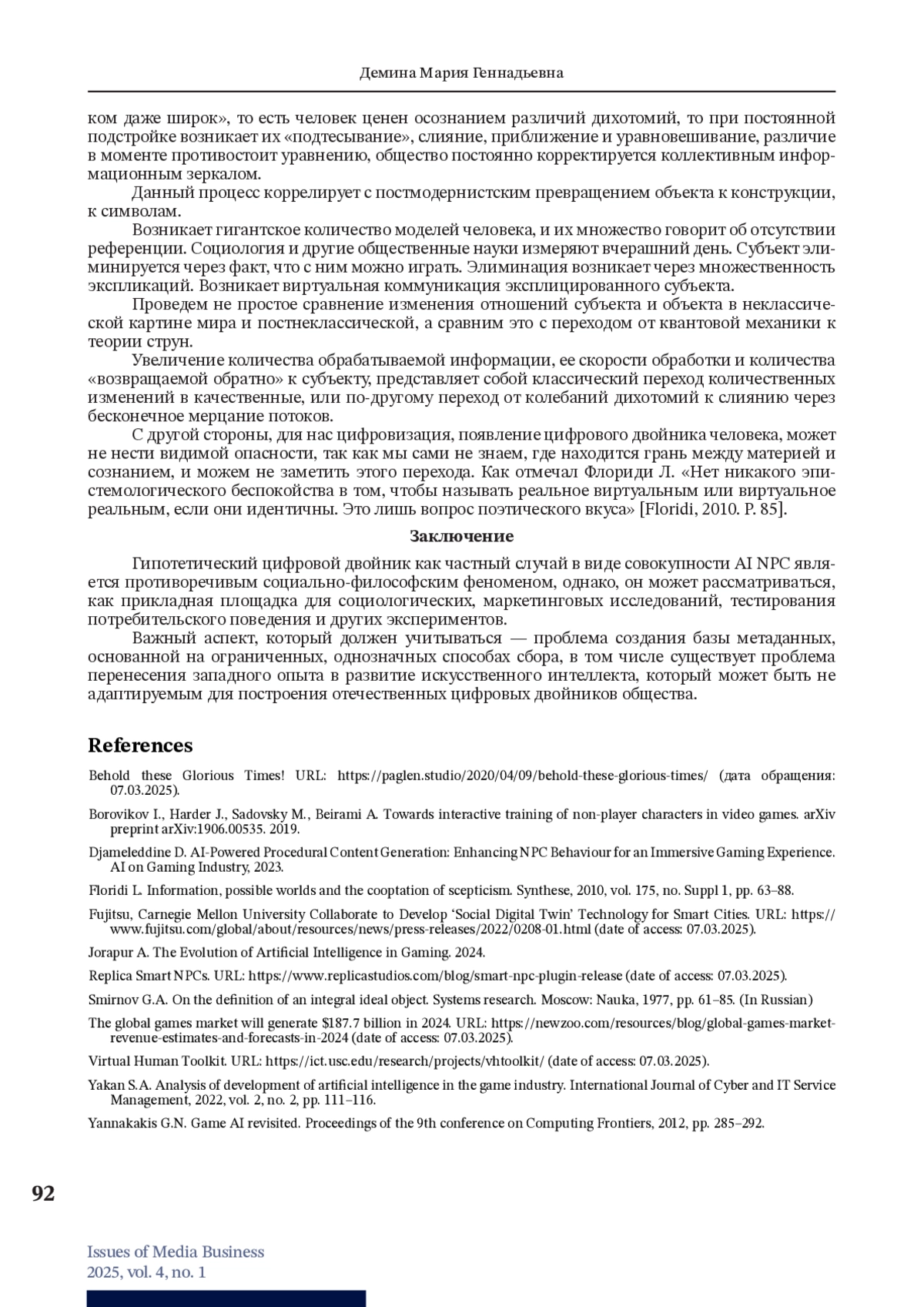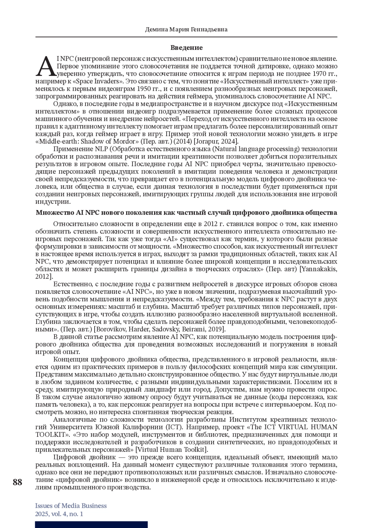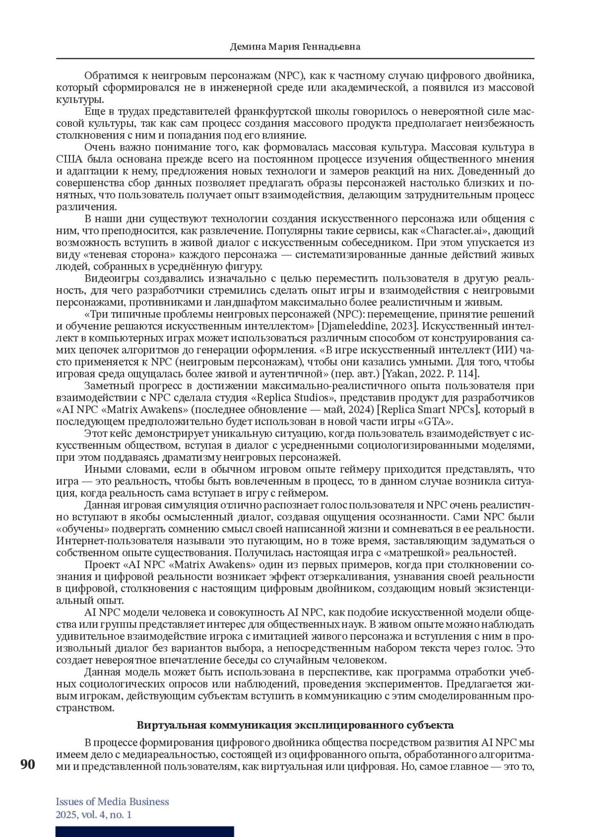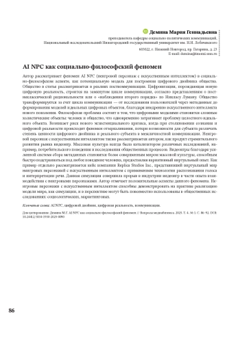 ДЕМИНА М. Г. AI NPC КАК СОЦИАЛЬНО-ФИЛОСОФСКИЙ ФЕНОМЕН // ВОПРОСЫ МЕДИАБИЗНЕСА. 2025. № 1, ТОМ 4