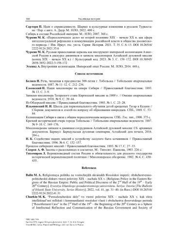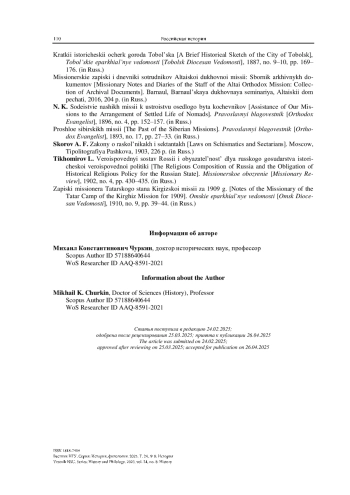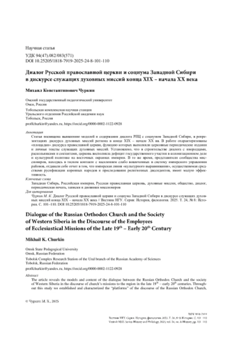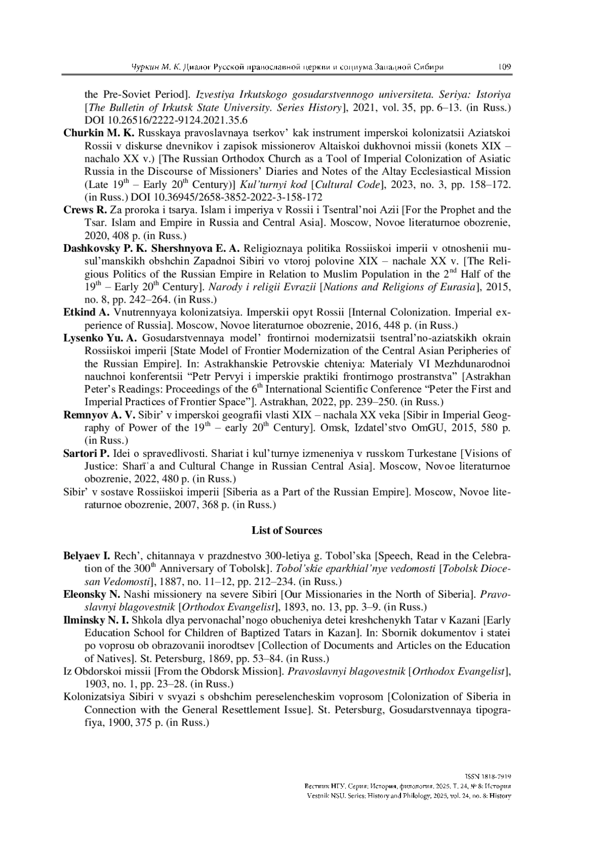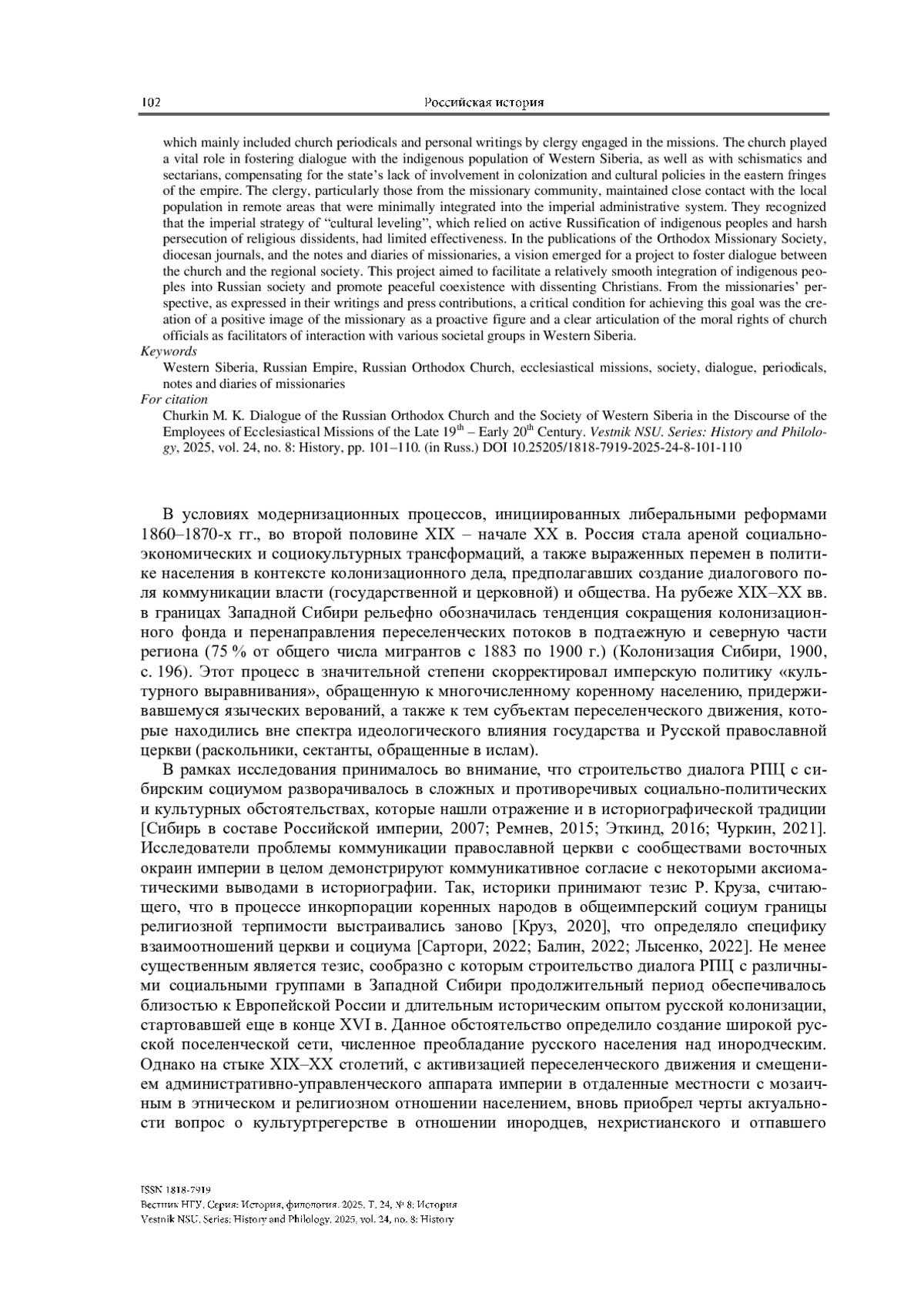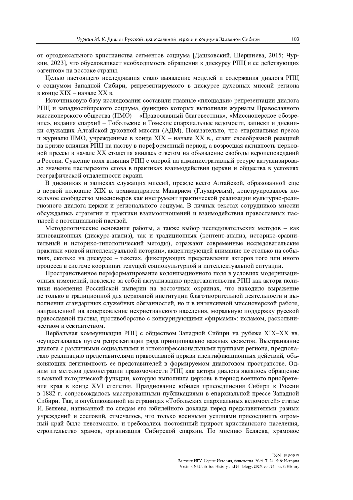 ЧУРКИН М. К. ДИАЛОГ РУССКОЙ ПРАВОСЛАВНОЙ ЦЕРКВИ И СОЦИУМА ЗАПАДНОЙ СИБИРИ В ДИСКУРСЕ СЛУЖАЩИХ ДУХОВНЫХ МИССИЙ КОНЦА ХIХ – НАЧАЛА ХХ ВЕКА // ВЕСТНИК НГУ. СЕРИЯ: ИСТОРИЯ, ФИЛОЛОГИЯ. 2025. ТОМ 24, № 8
